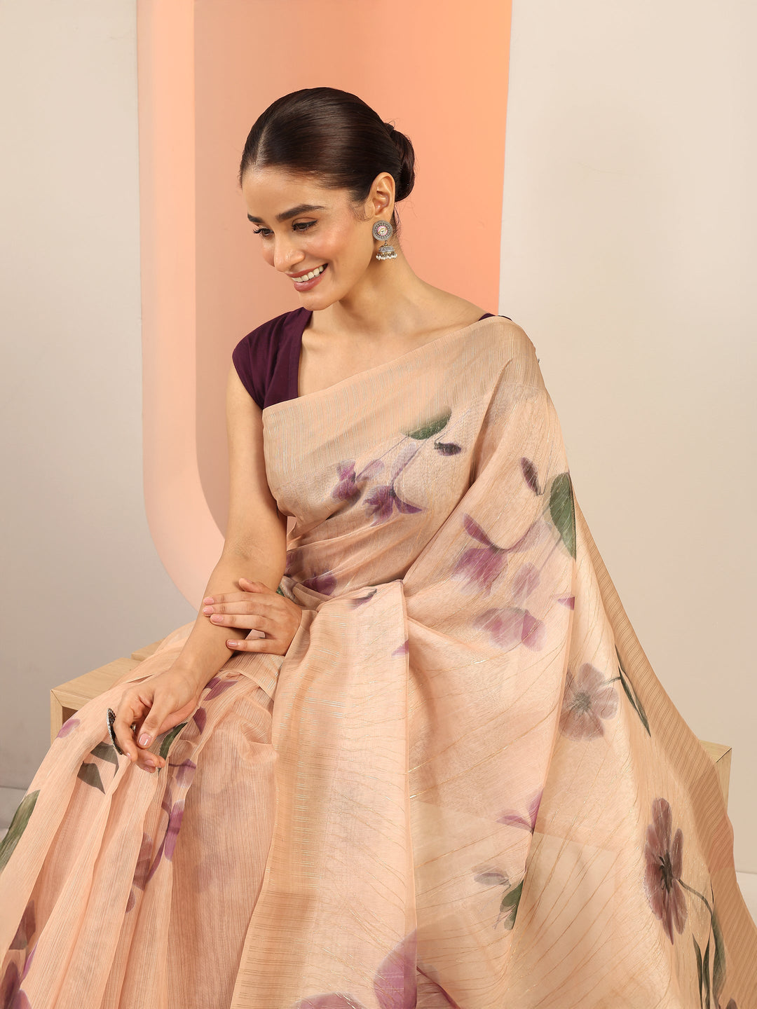 Peach Printed Silk Saree With Unstitched Blouse Piece