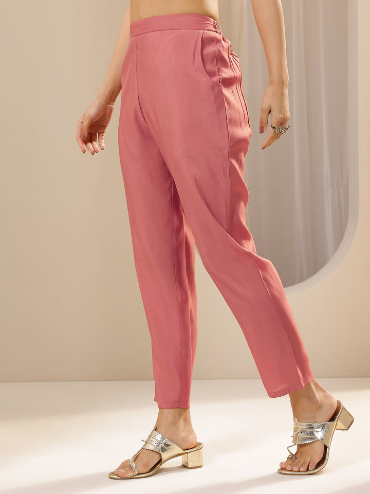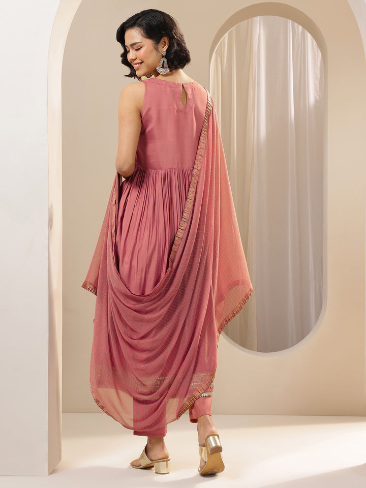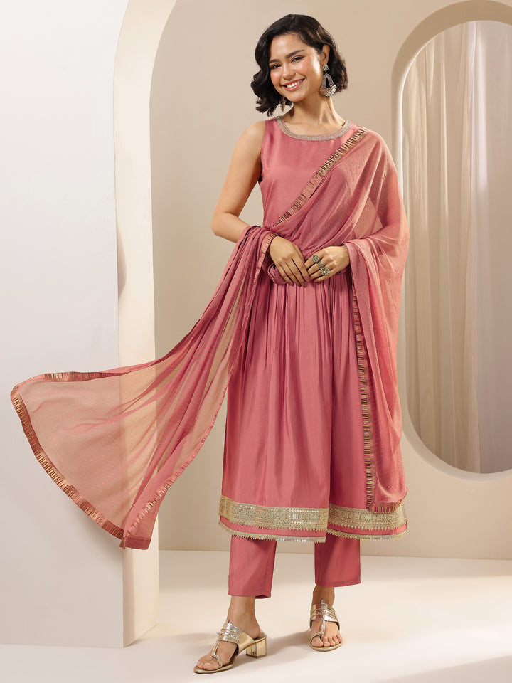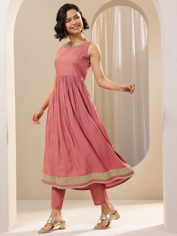 Our 3-piece Pink Silk Blend Anarkali Kurta Set features a Round Neckline and statement yoke. Complemented with Straight Pants with a partially elasticated waistband and 2 pockets, and a Solid dupatta. Adorned with Solid embellishments, this style is perfect for Semi festive occasions.