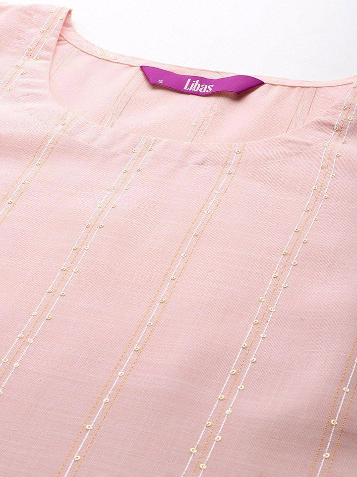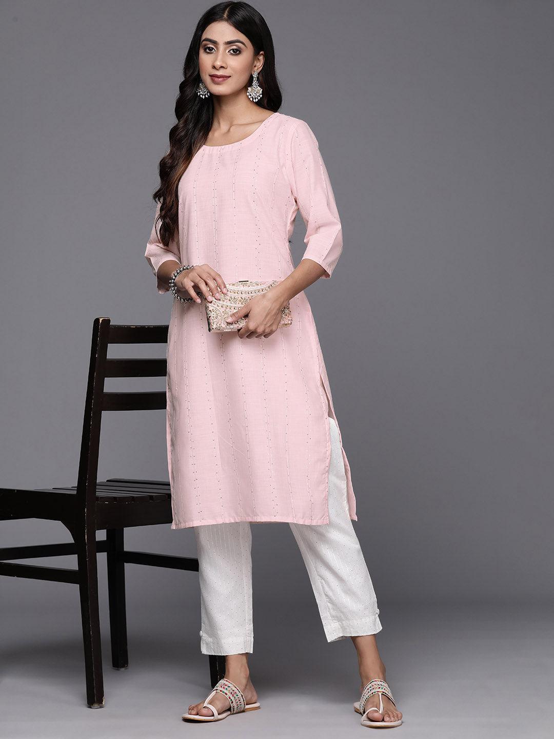 Our peach straight-fit kurta, crafted in comfortable cotton fabric, features a round neckline and three-quarter sleeves. Adorned with thread work and sequins detailing, this style is perfect for casual outings.