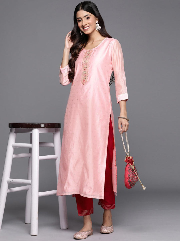 Our pastel pink straight-fit kurta, crafted in sumptuous Chanderi silk fabric features a round neckline, three-quarter sleeves, and a statement yoke. Adorned with intricate floral embroidery, delicate fabric-trim, Gota Patti and sequins accents, this charming style is ideal for daytime festivities