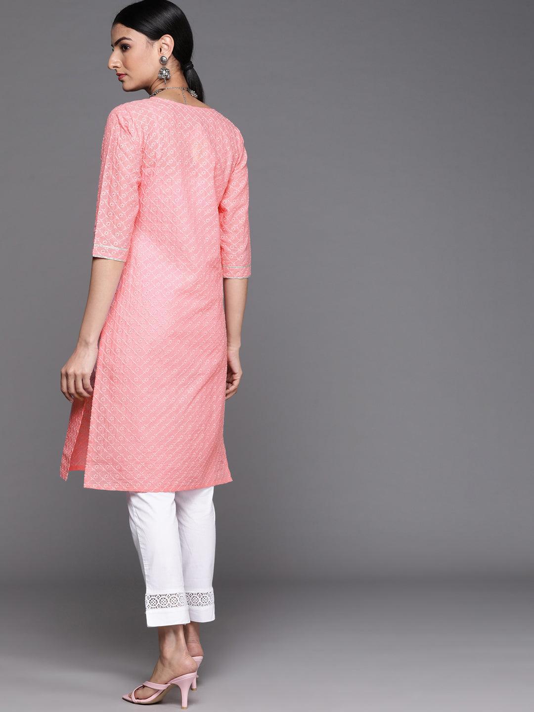 Our pink embroidered cotton straight-fit kurta features a round neckline with complementing Gota Patti accents on the yoke and cuffs. Ideal for elevated everyday wear.