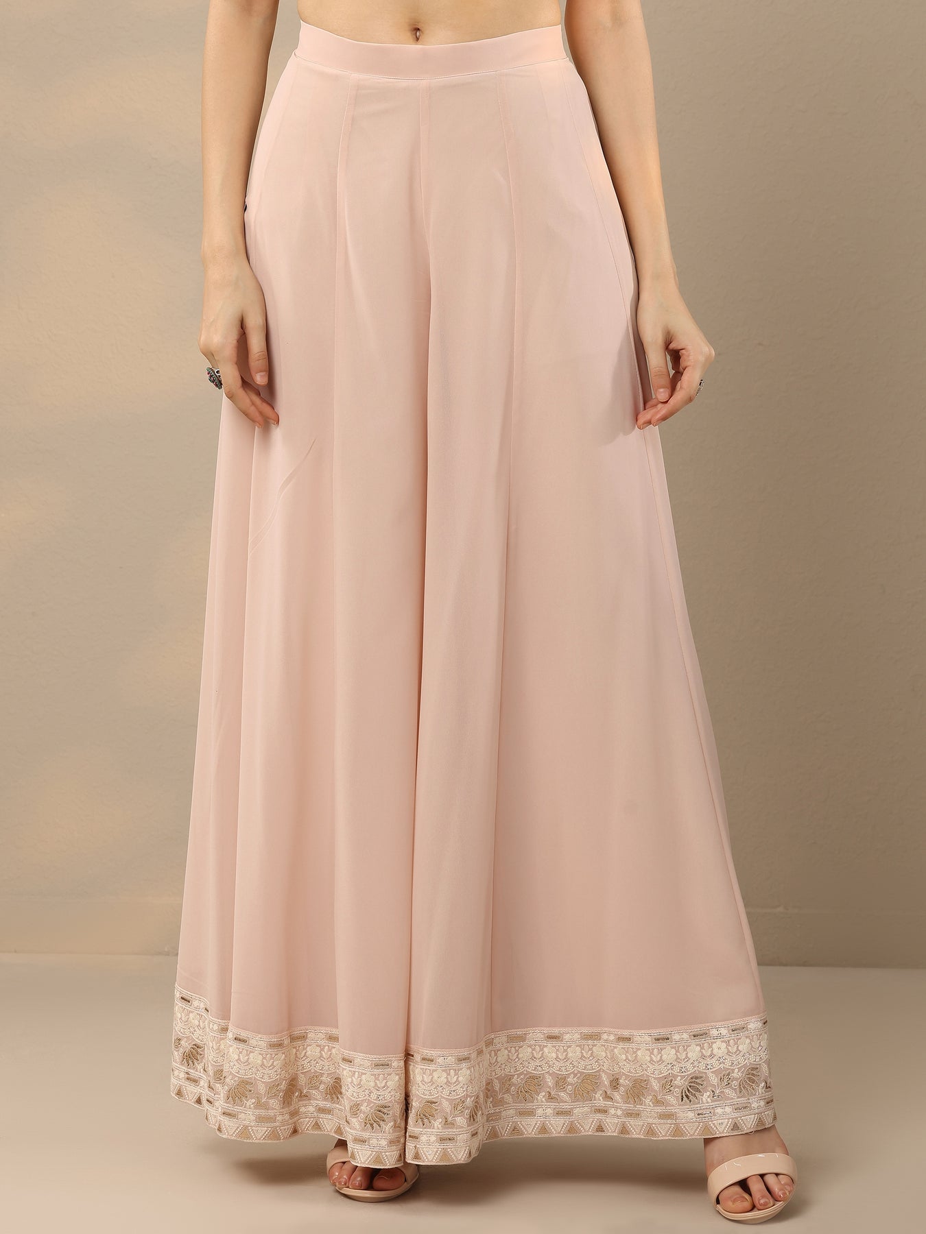 Our 3-piece pink embroidered poly georgette co-ord set features an embellished V-neck crop top with short sleeves and pleated detailing. Complemented with flared palazzos with a partially elasticated waistband and a dupatta. Adorned with intricate thread work and sequins, this charming style is perfect for light festivities.