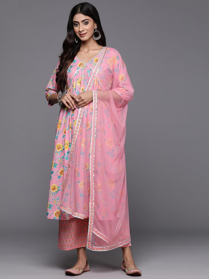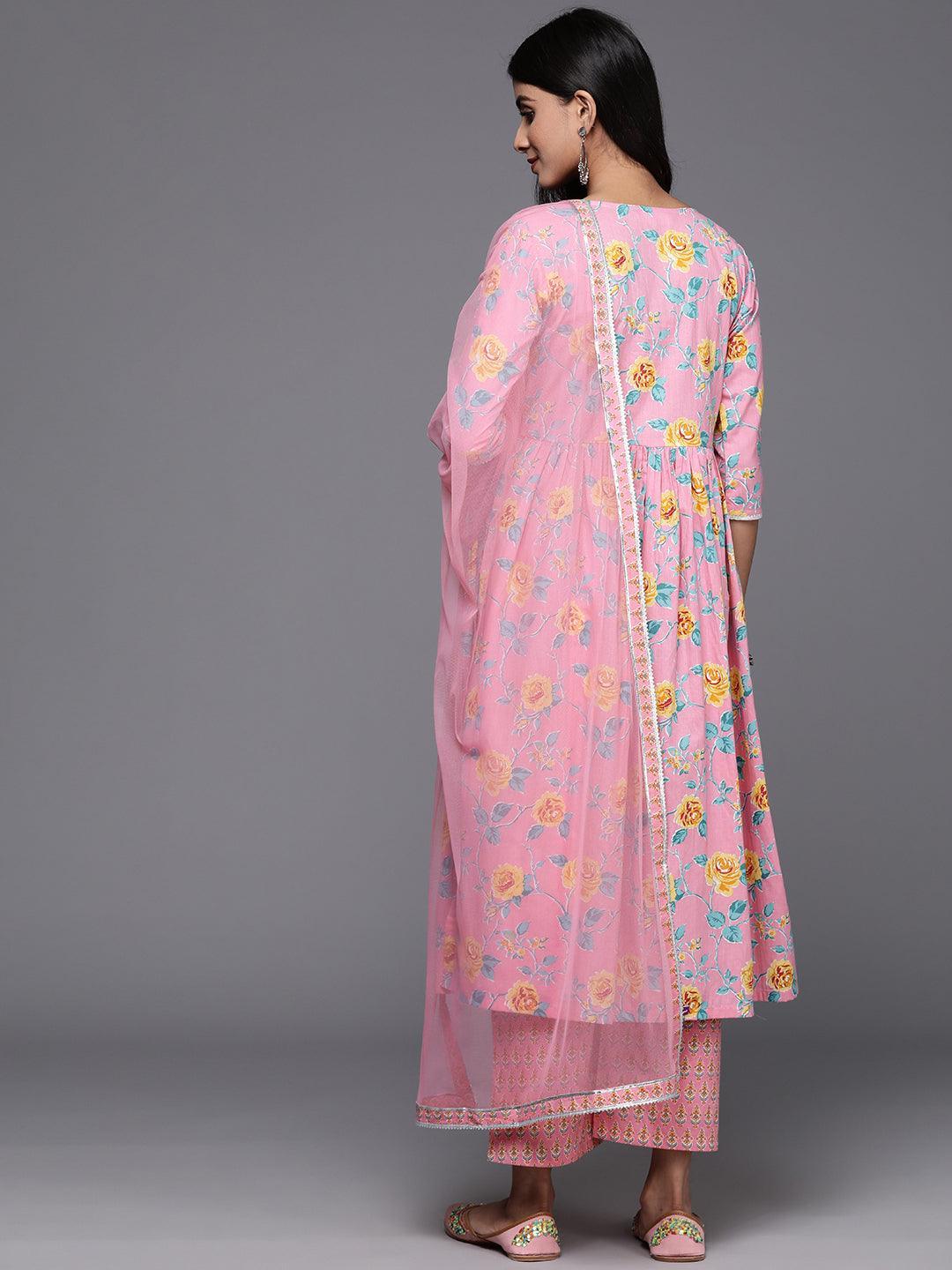 Pink Printed Cotton A-Line Kurta With Palazzos & Dupatta - Libas