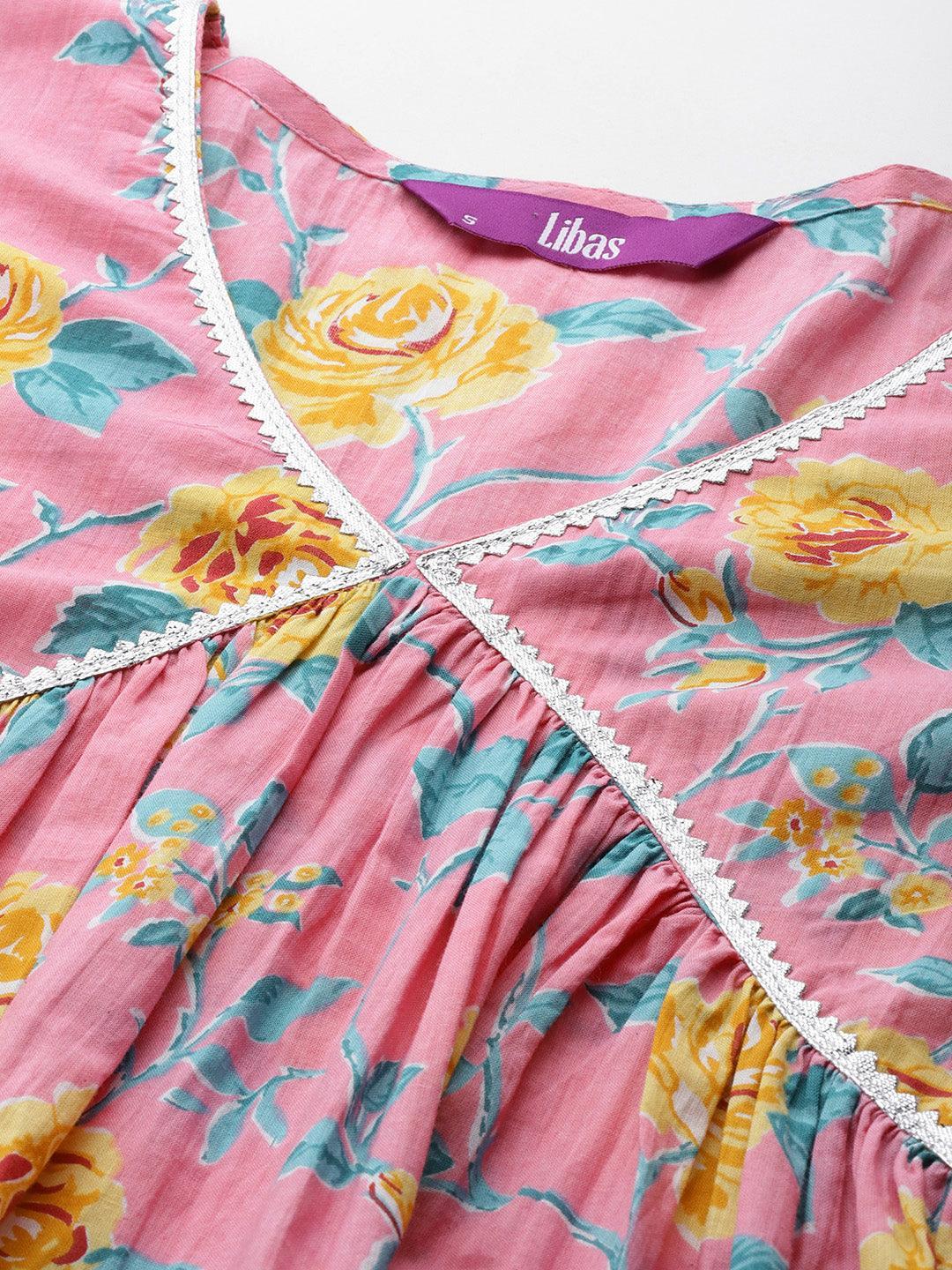 Our 3-piece pink printed cotton suit set features an A-line floral print kurta with a V-neckline and three-quarter sleeves. Complemented with trousers with palazzo pants with a partially elasticated waistband and roomy pockets, and a dupatta. Adorned with Gota Patti detailing, this style is perfect for casual outings.