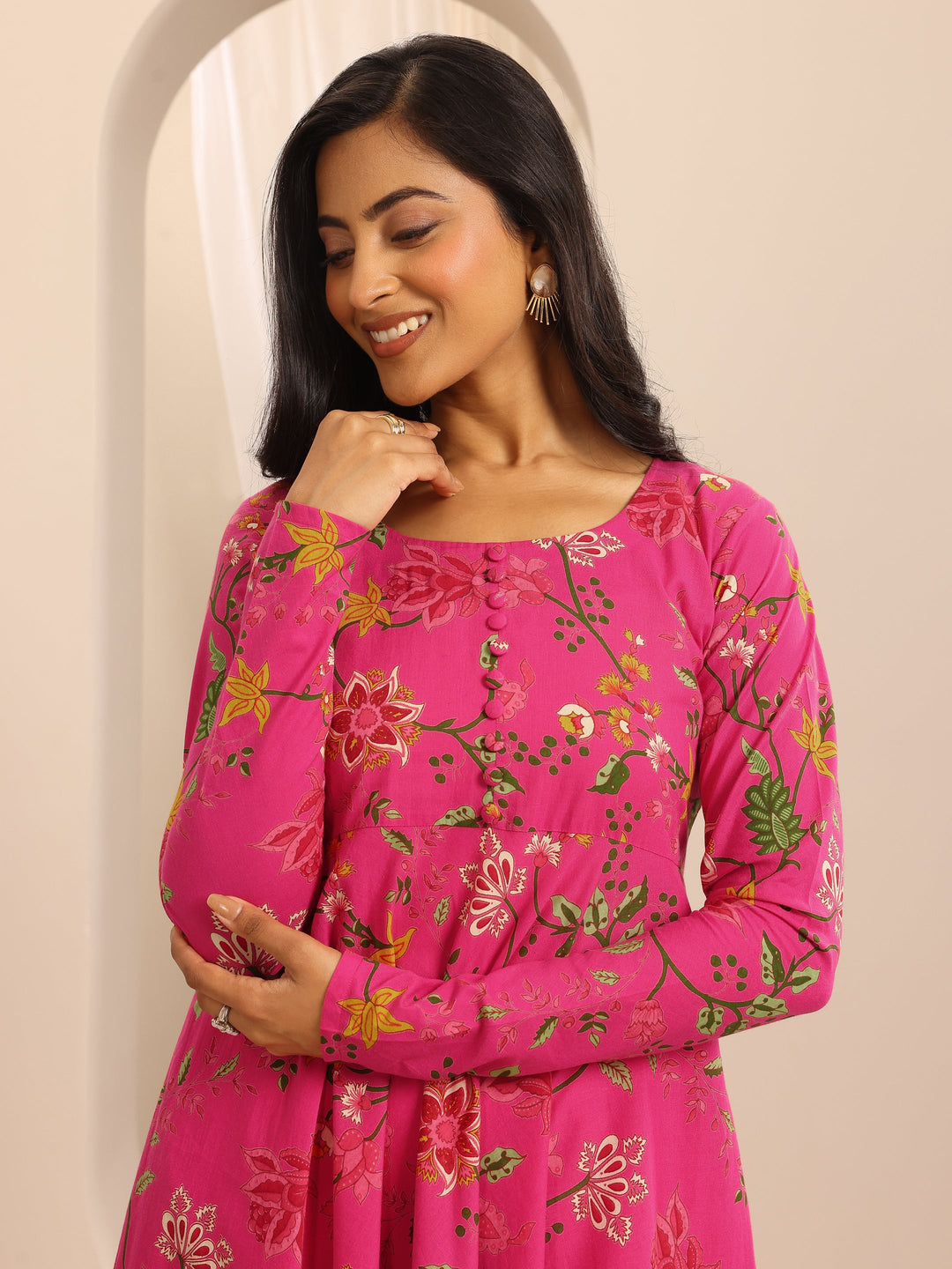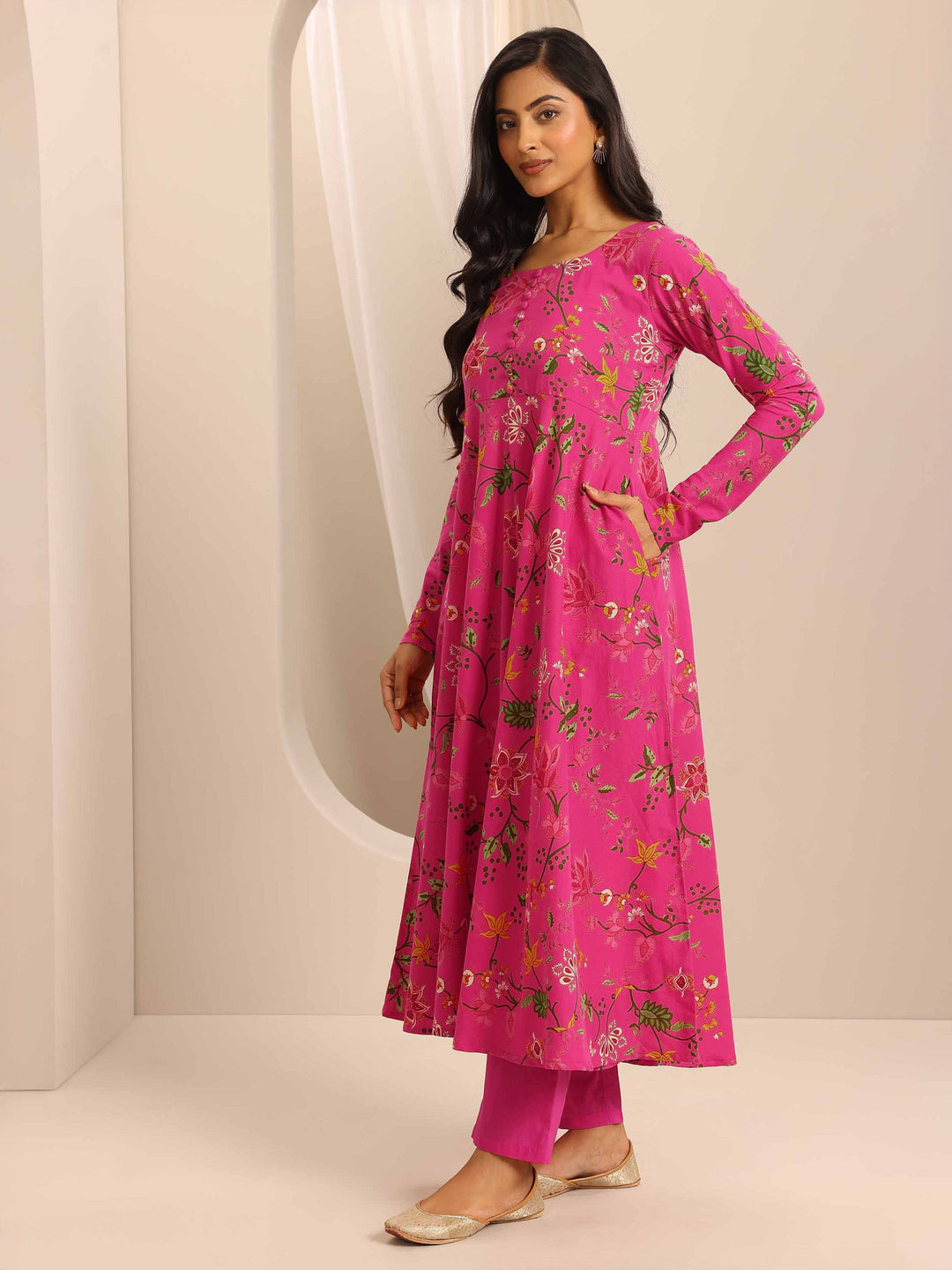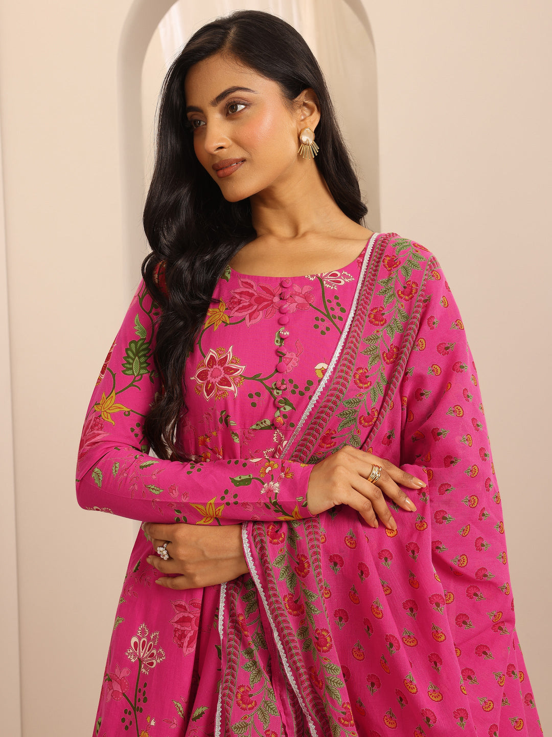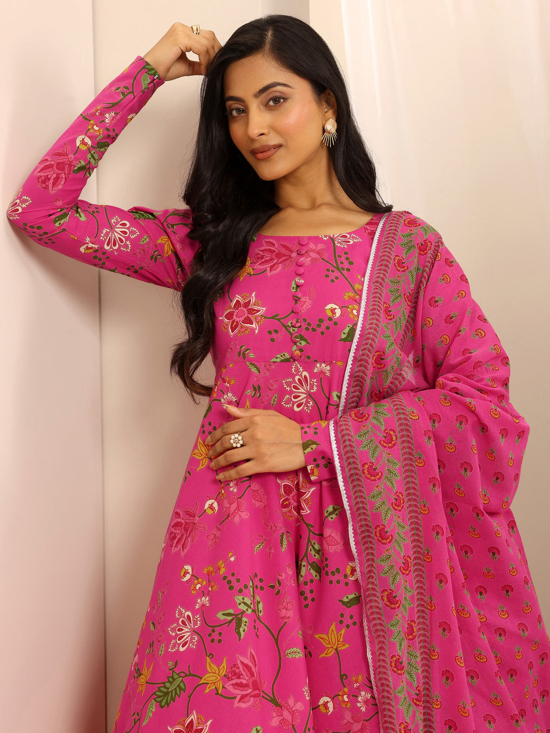 Our 3-piece pink cotton Anarkali kurta set features a round neckline, regular sleeves, and a statement flared yoke. Complemented with straight pants with a partially elasticated waistband and 2 pockets, and a floral dupatta. Adorned with floral printed accents, this style is perfect for semi festive wear.
