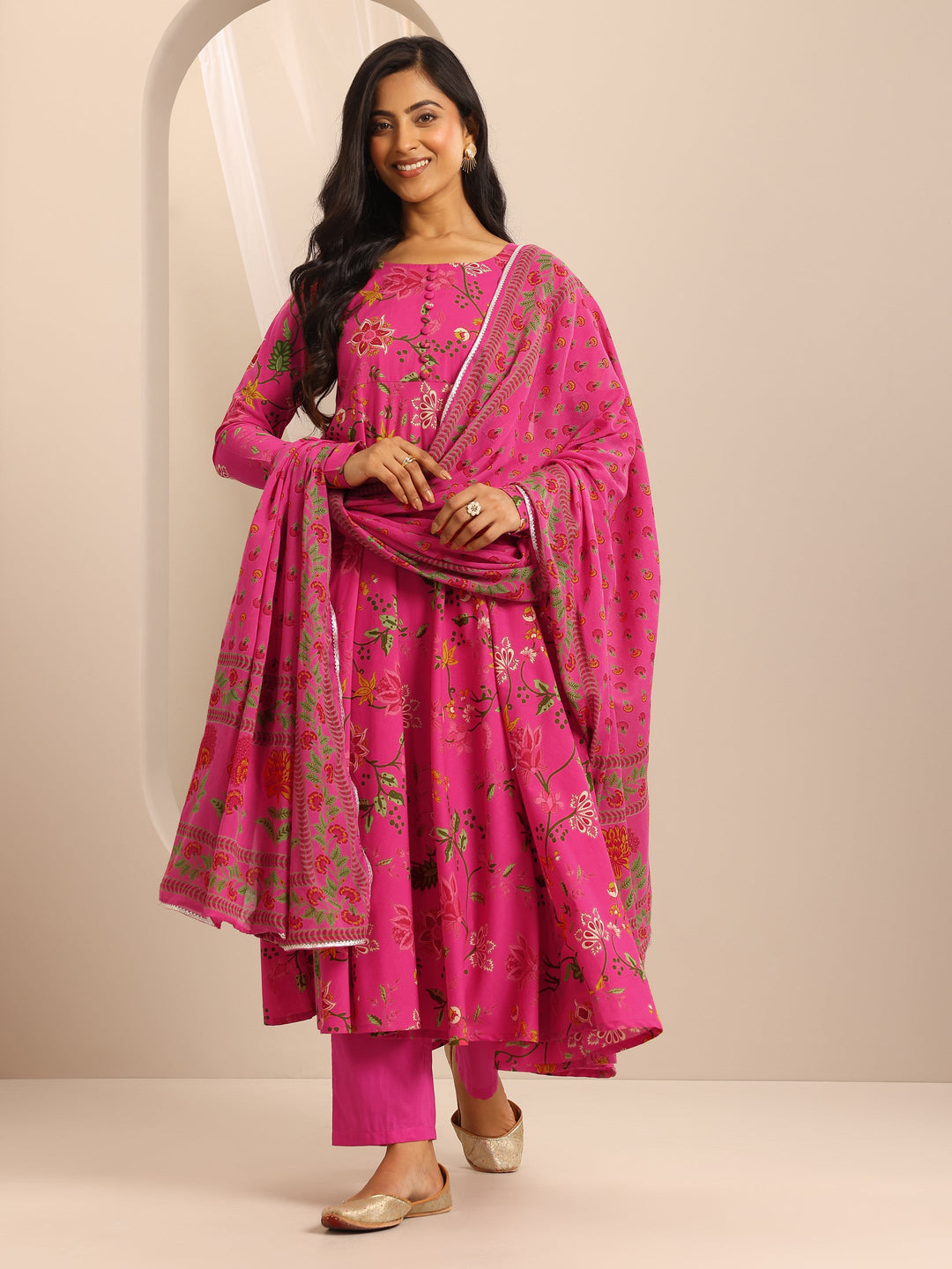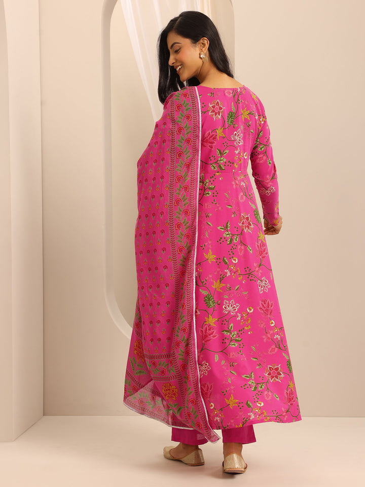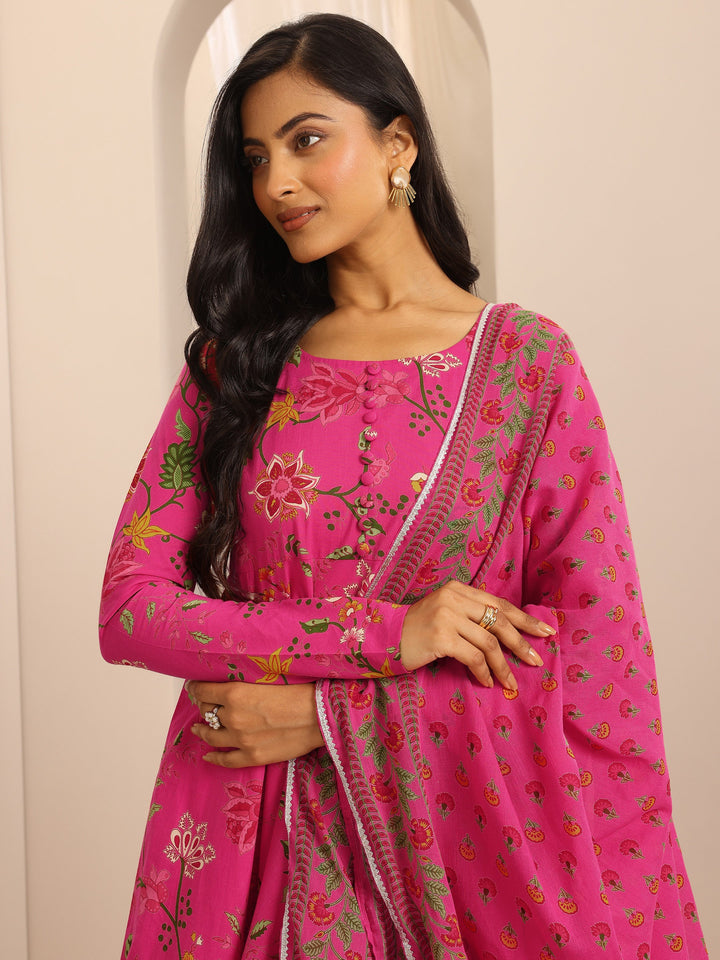 Pink Printed Cotton Blend Anarkali Suit Set With Dupatta
