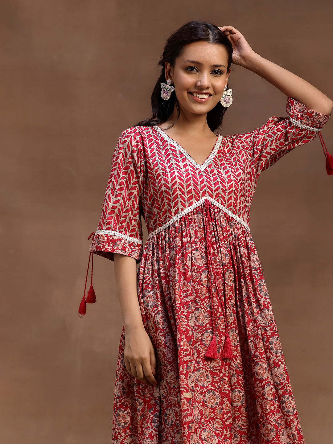 Our pink printed midi dress, crafted in cotton fabric, features a V-neckline and three-quarter sleeves. Elevated with captivating floral prints lace detailing, and dori work, this style is perfect for casual outings.