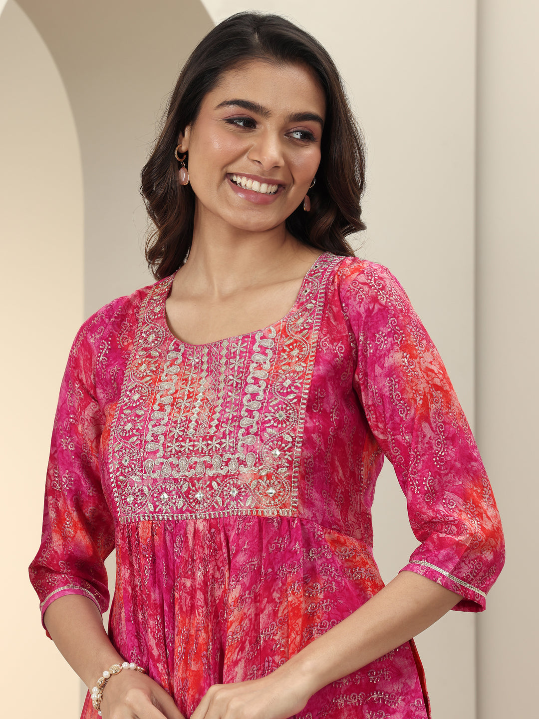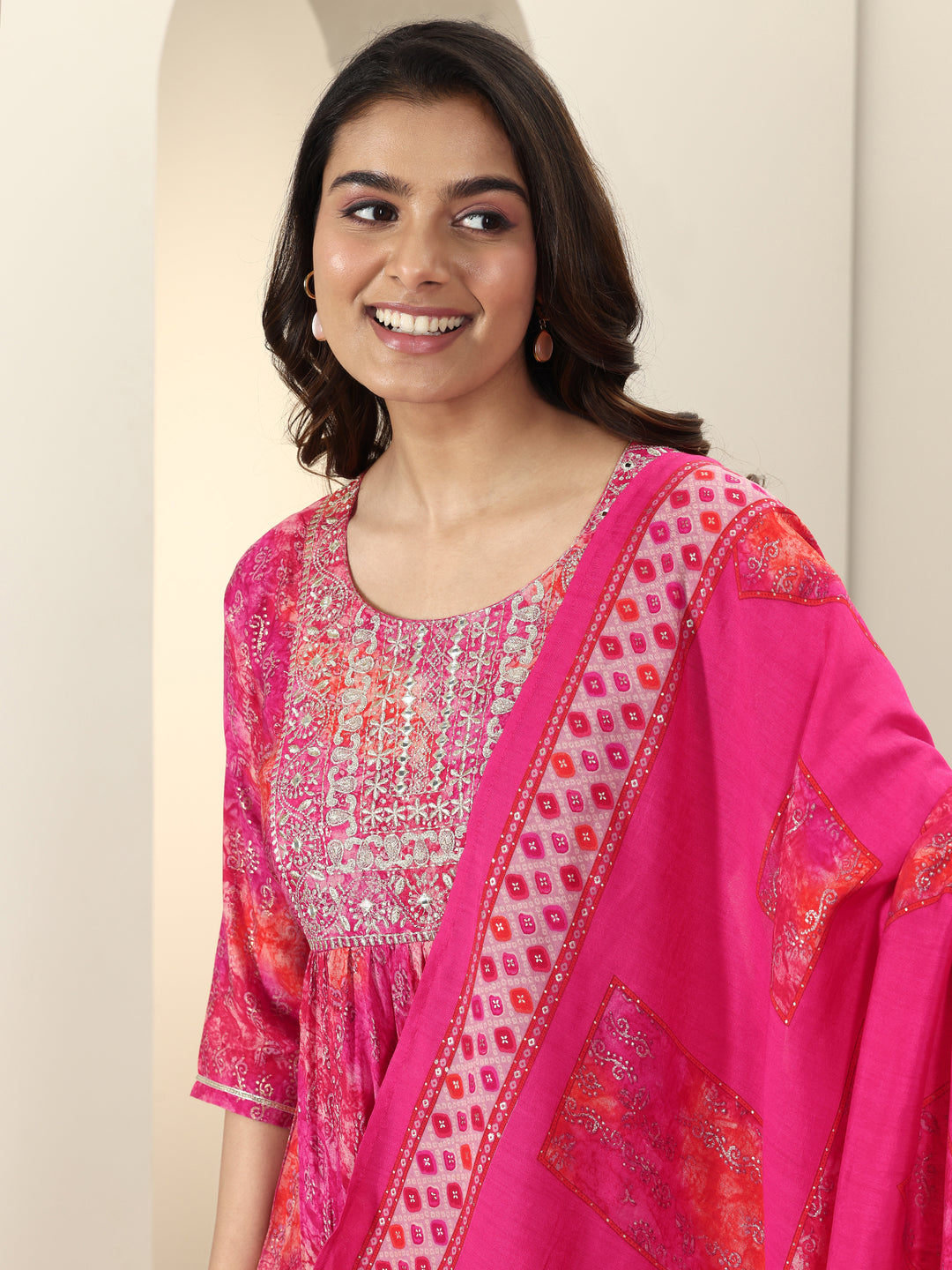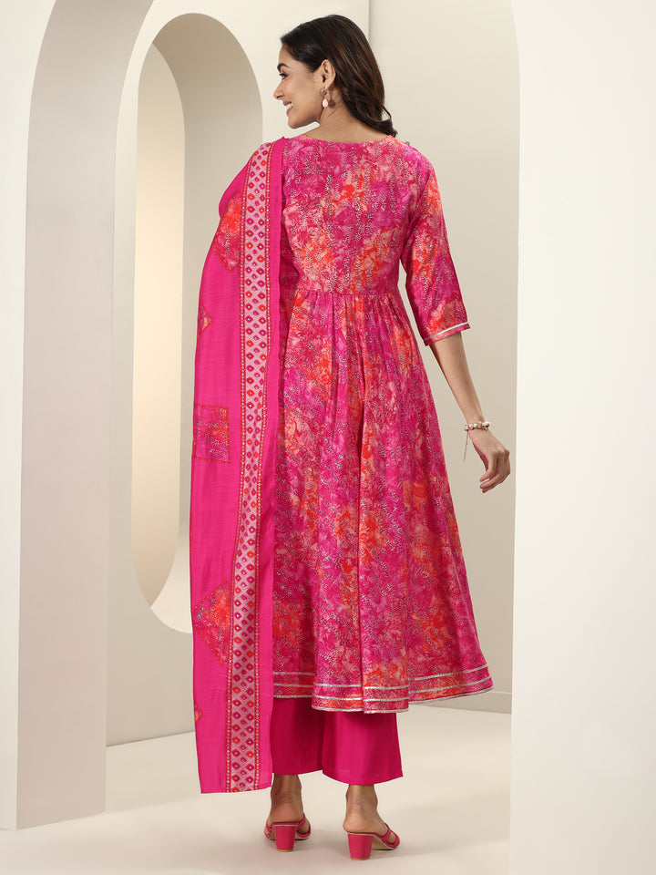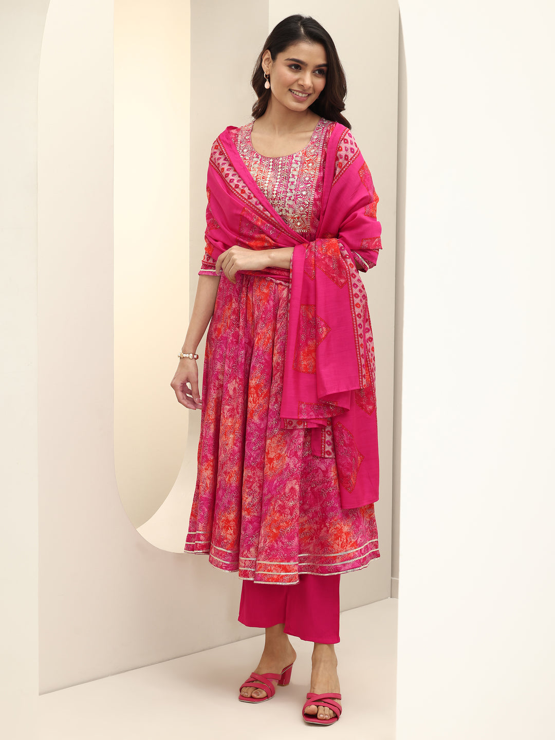 Pink Printed Silk Blend Anarkali Suit Sets With Dupatta