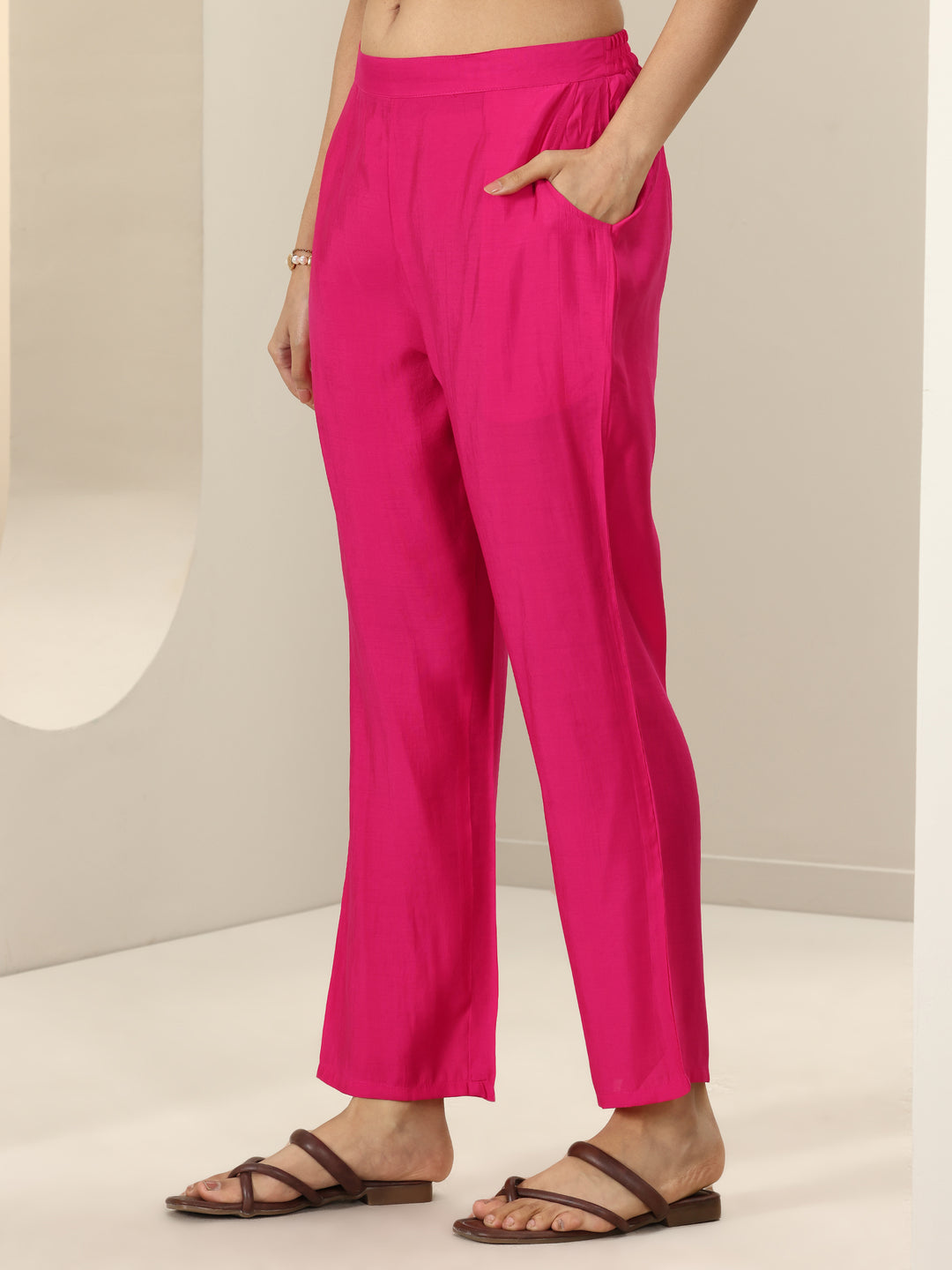 Our 3-piece pink silk blend features an Anarkali kurta set with a round neckline, regular sleeves, and statement yoke. Complemented with straight pants with an elasticated waistband and a printed dupatta. Adorned with embroidered accents, this style is perfect for festive occasions.