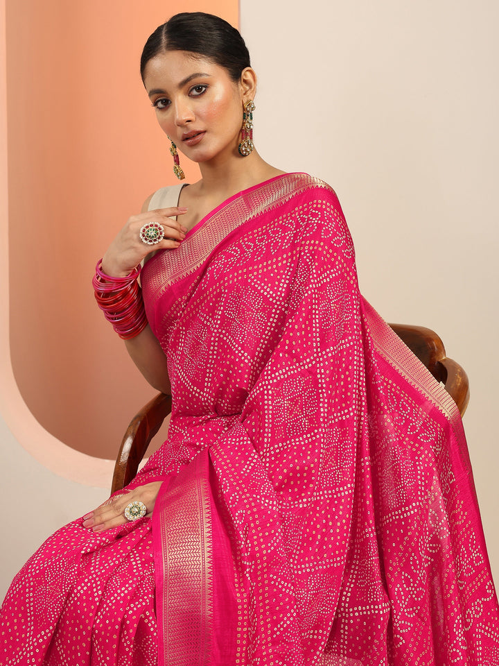 Our Red Printed Silk Blend Saree Features Captivating Bandhani Prints. Complemented With An Unstitched Blouse Piece. This Charming Saree Is Perfect For Festive Wear