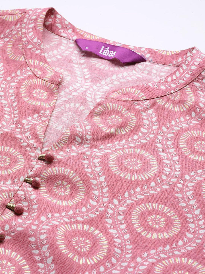 Our pink printed fit and flare silk dress features a mandarin notched neckline, stylish roll-up sleeves, a flared hemline and roomy pockets. Elevated with handcrafted fabric buttons and front-slit detailing, this charming style is perfect for casual outings.