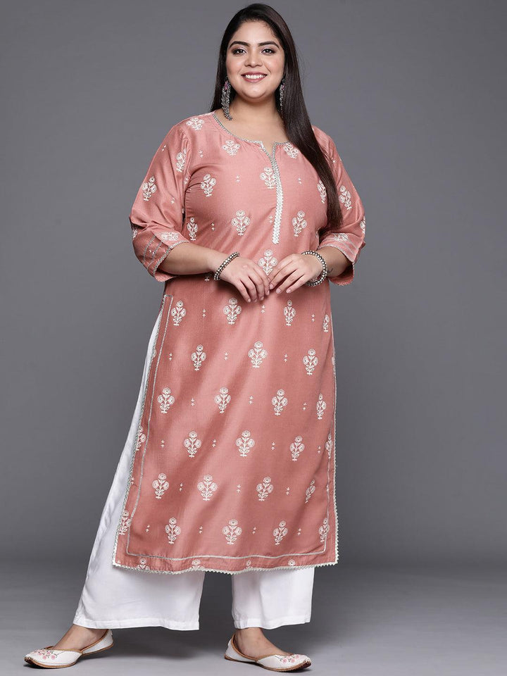 Plus Size Pink Silk Printed Straight Kurta - ShopLibas