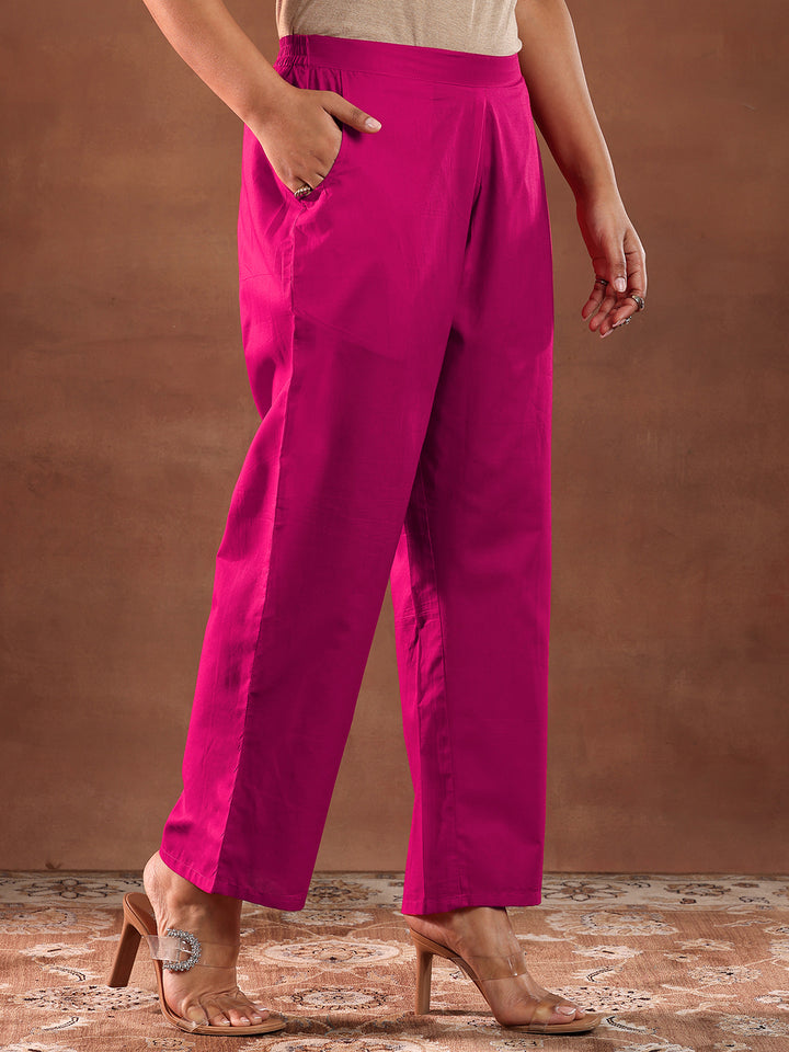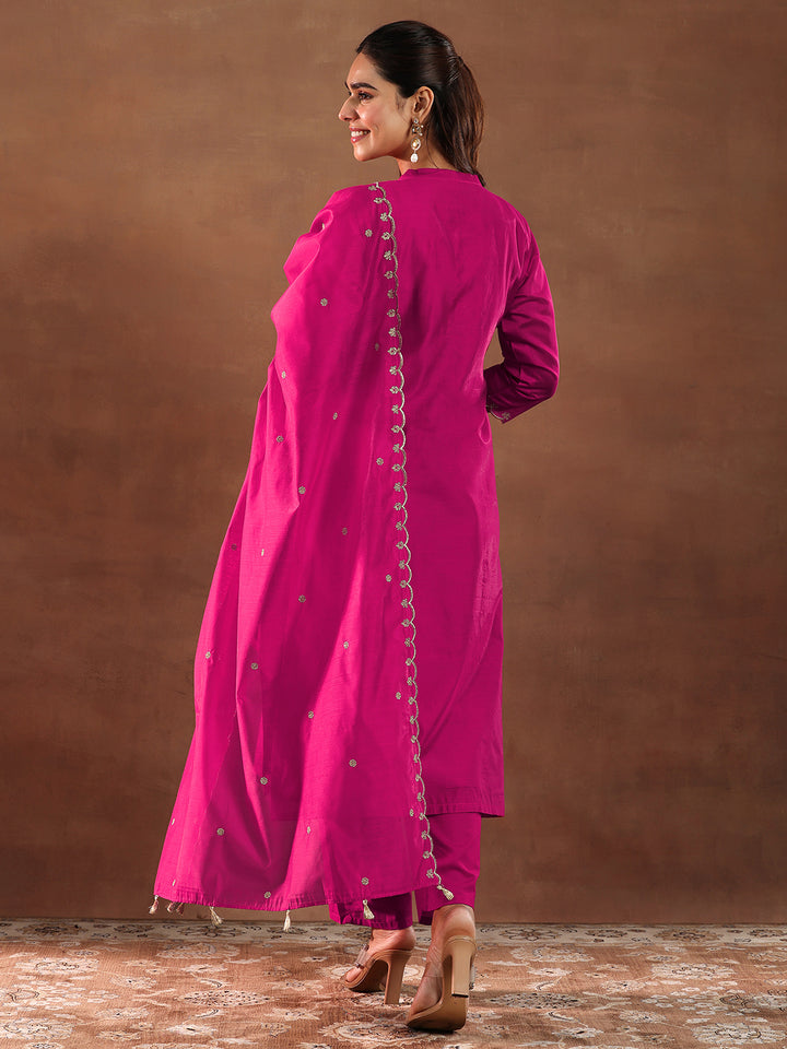 Our 3-piece pink yoke design Chanderi silk straight suit set features a kurta with a mandarin collar, three-quarter sleeves, and a statement yoke. Complemented with trousers with a partially elasticated waistband and roomy pockets, and a dupatta. Highlighted with embroidery, handcrafted button accents, and tassels, this style is perfect for festive celebrations.