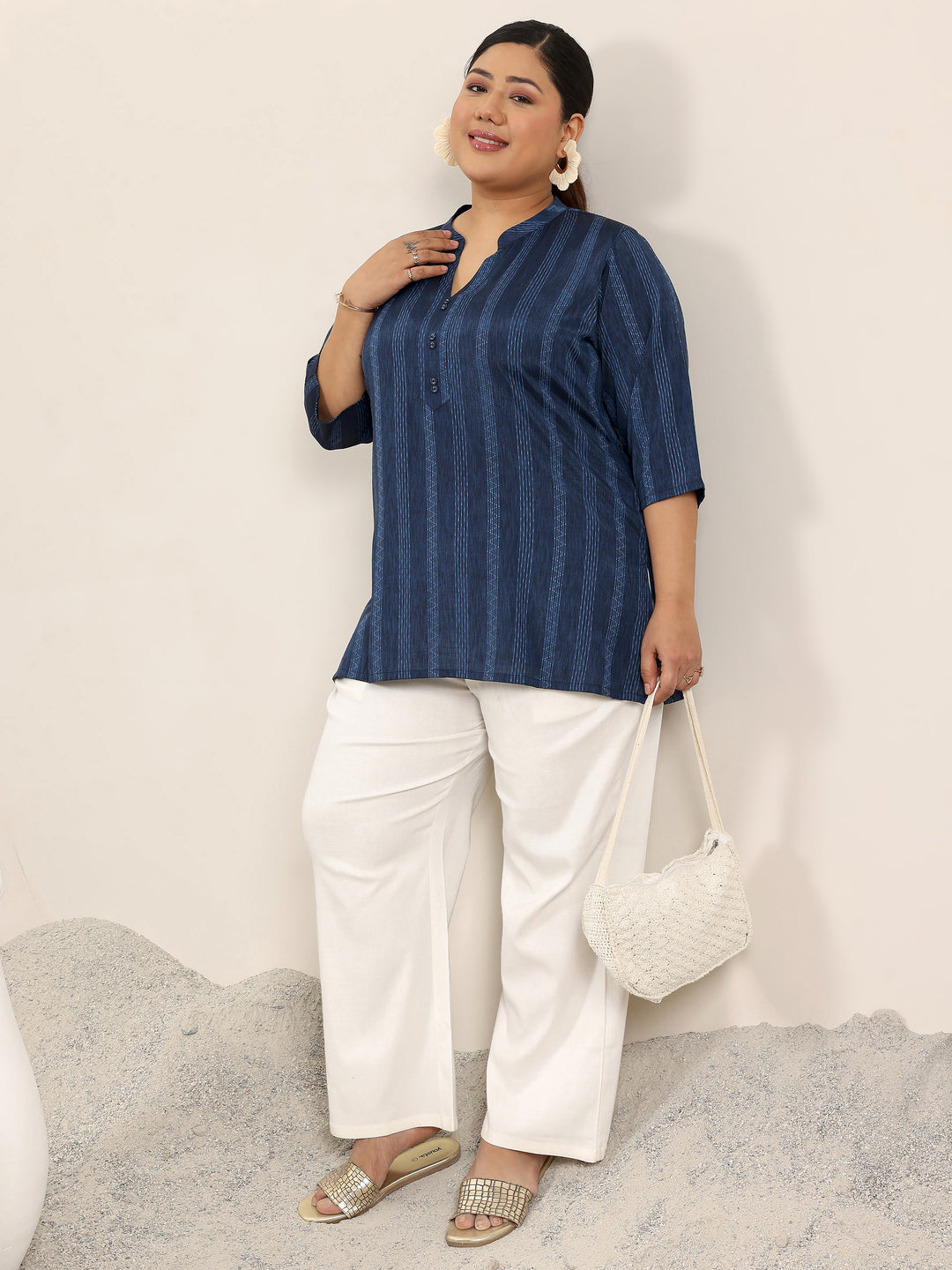 Plus Size Blue Woven Design Cotton Blend Straight Kurti