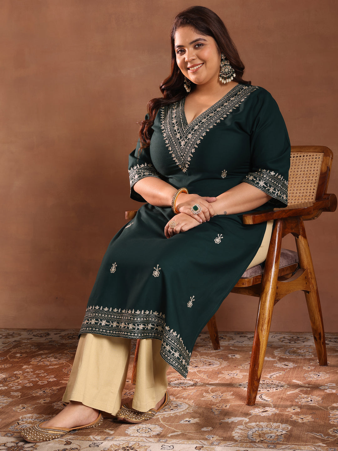 Plus Size Green Embroidered Rayon Straight Kurta