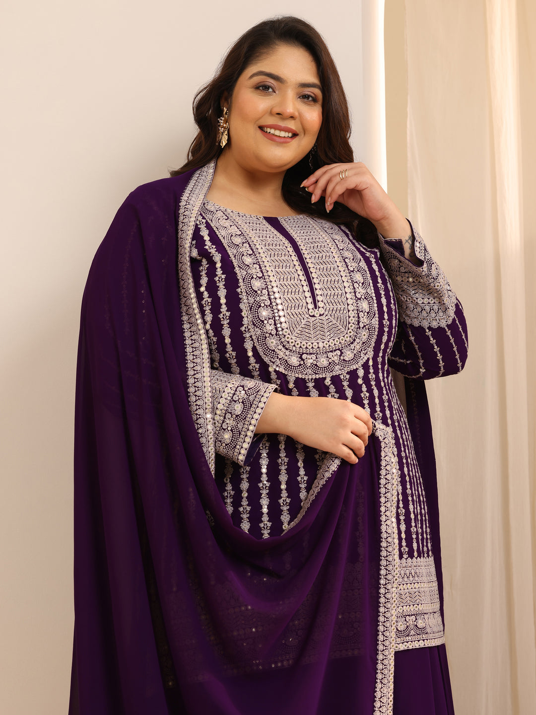 Plus Size Purple Embroidered Georgette A line Suit Set With Dupatta