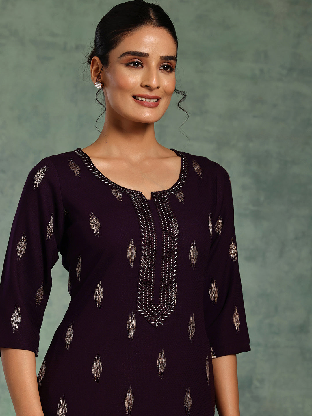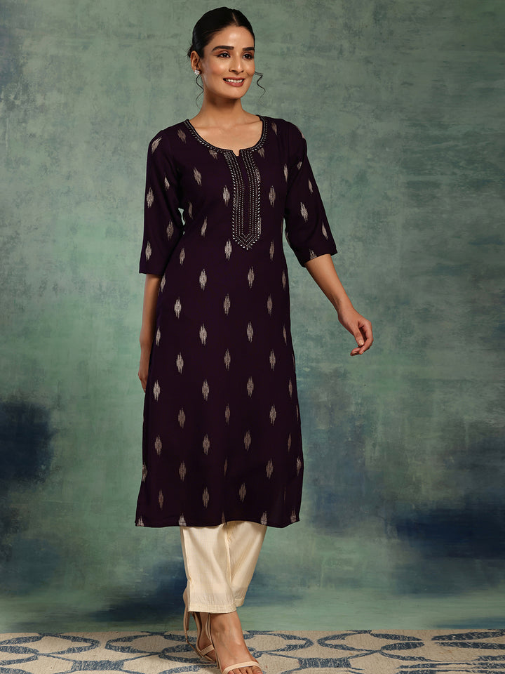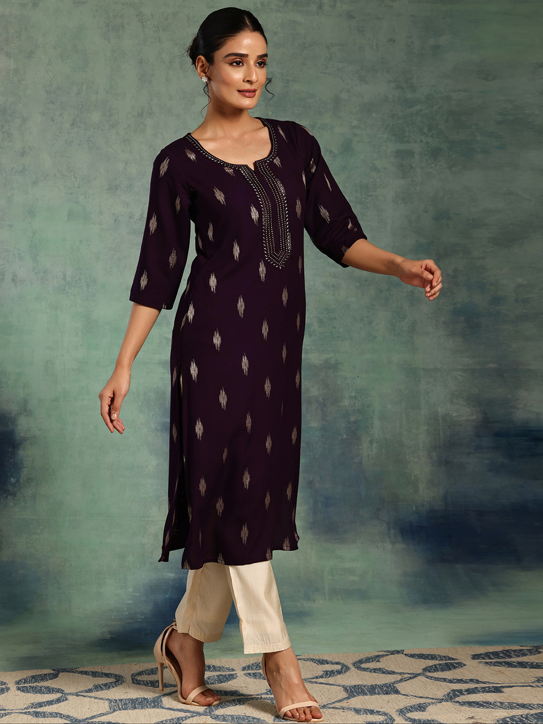 Our purple woven design kurta, crafted in breezy viscose rayon fabric, features a U-notched neckline, three-quarter sleeves, and a statement yoke. Adorned with intricate thread work, this style is perfect for elevated everyday wear.