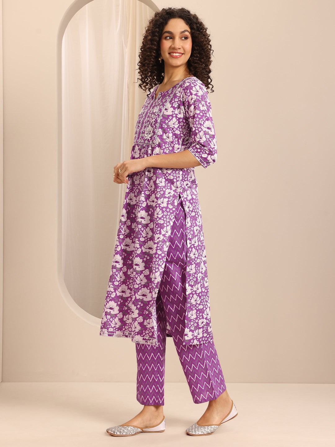 Our 3-piece purple cotton A-line kurta set features a V-neckline, regular sleeves, and a statement yoke. Complemented with straight pants with a partially elasticated waistband and 2 pockets, and a solid dupatta. Adorned with floral printed accents, this style is perfect for semi festive wear.