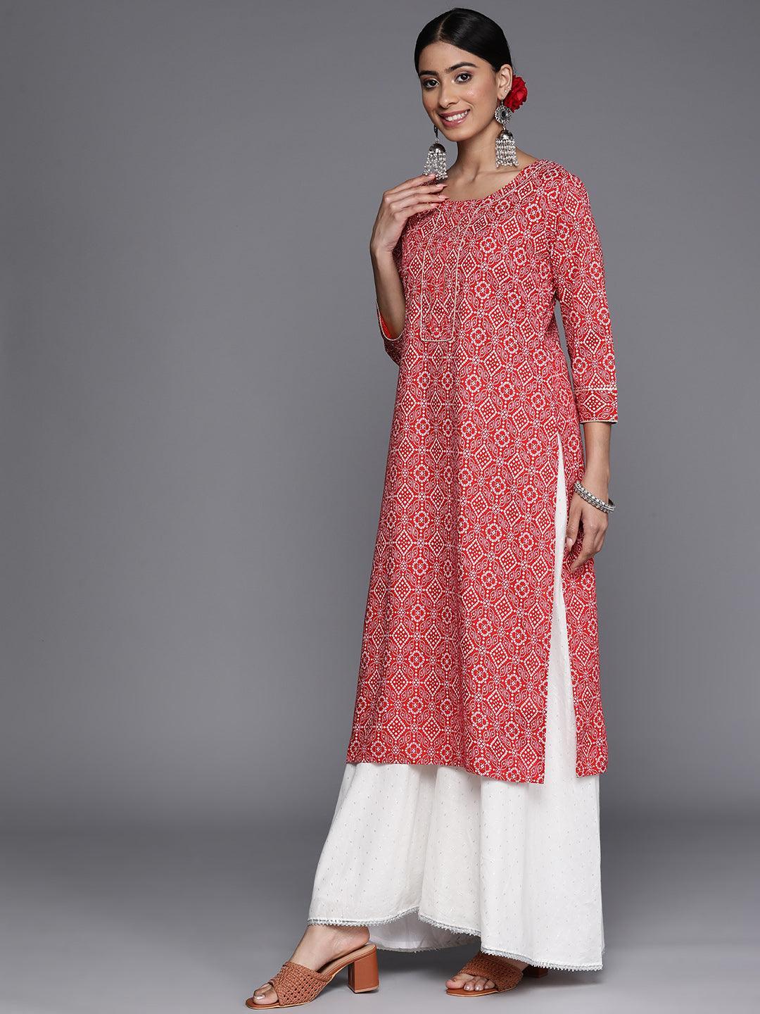 Our red Bandhani inspired print straight-fit cotton kurta features a round neckline and three-quarter sleeves. Adorned with delicate Gota Patti accents. This charming style is ideal for light festivities.