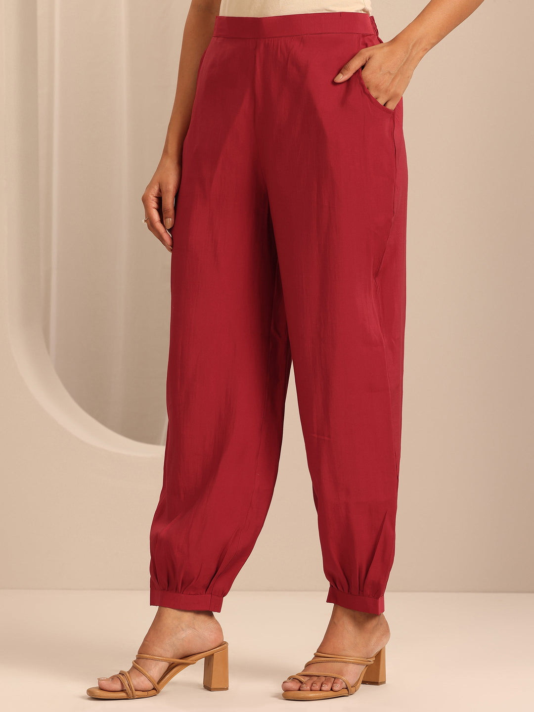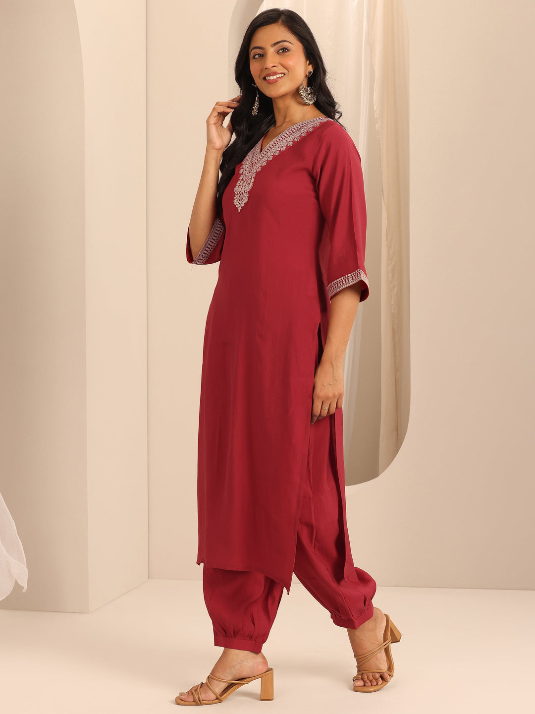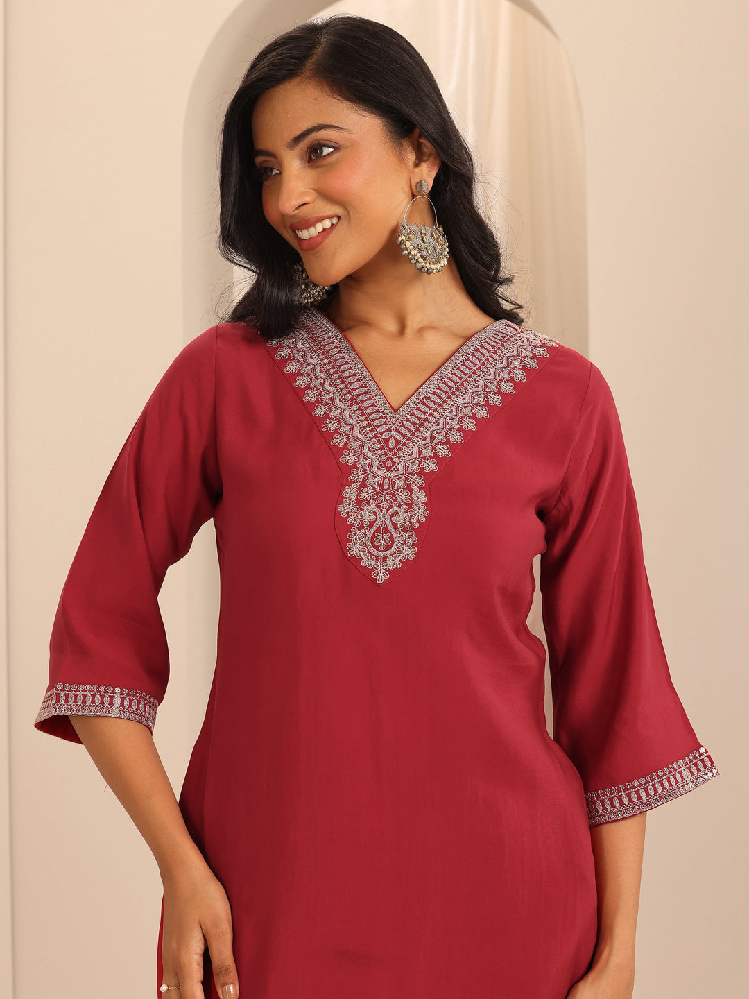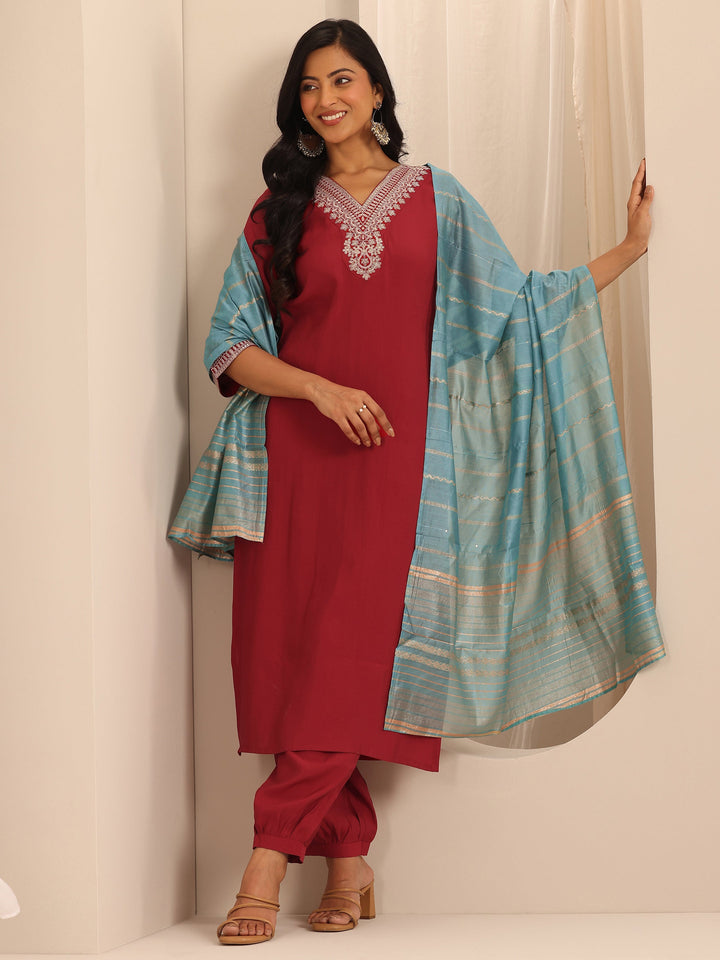 Our 3-piece Red Silk blend Kurta Set features a Straight-fit kurta with a V-Neckline, Regular Sleeves, and statement yoke. Complemented with Salwar Pants with a Partially Partially Elasticated waistband, and a Printed dupatta. Adorned with Embroidered accents, this style is perfect for Semi Festive occasions.