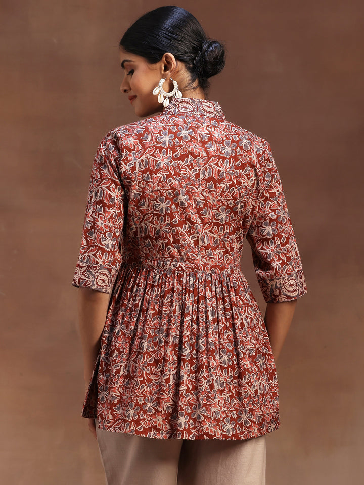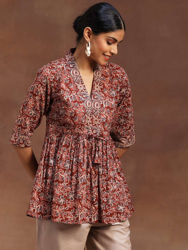 Our rust printed cotton A-line kurti features a V-neckline, three-quarter sleeves, and a drawstring closure at the waist. Elevated with floral print and fabric-trim detailing, this style is perfect for casual outings.