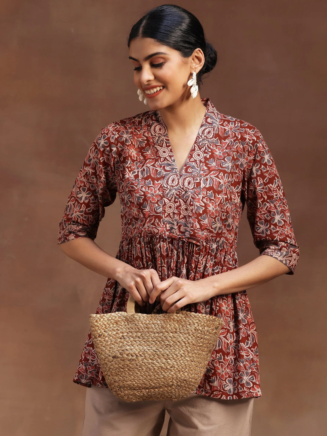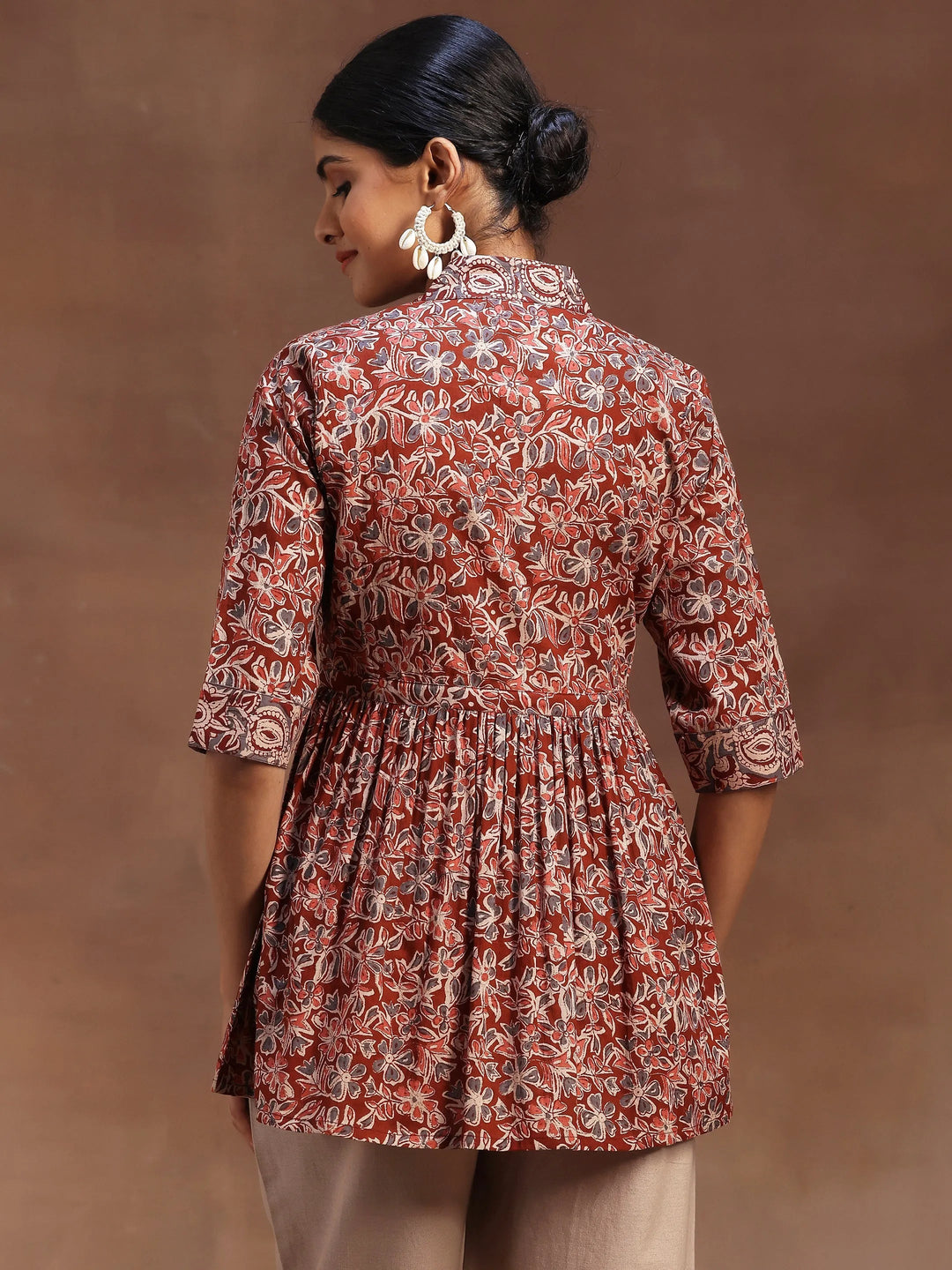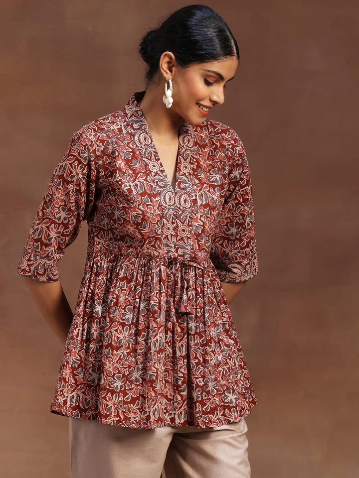 Our rust print cotton A-line kurti features a V-neckline and three-quarter sleeves. Elevated with captivating floral prints and fabric tassels, this style is perfect for casual outings.