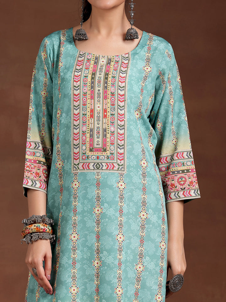Our sky blue printed straight-fit kurta, crafted in crepe fabric, features a round neckline and three-quarter sleeves. Elevated with ethnic motifs prints, this style is perfect for casual outings.