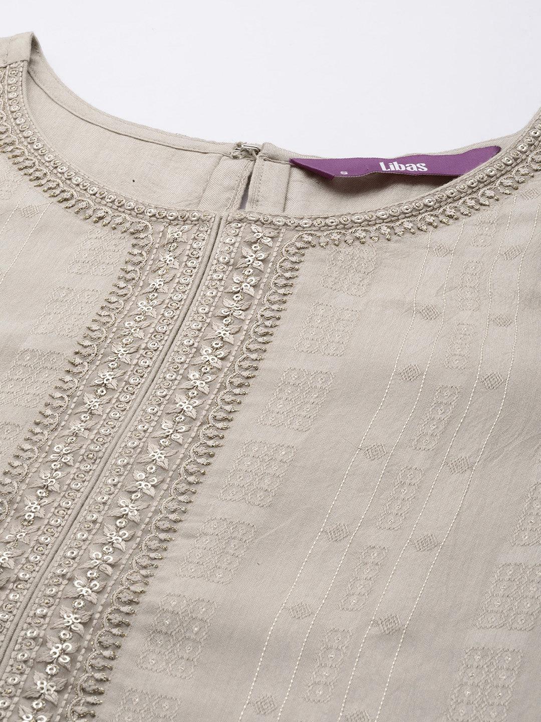 Our taupe kurta, crafted in soft rayon fabric, features a round neckline, keyhole detailing at the back, three-quarter sleeves, and a statement yoke. Adorned with sequins accents and thread work, this style is perfect for light festivities.
