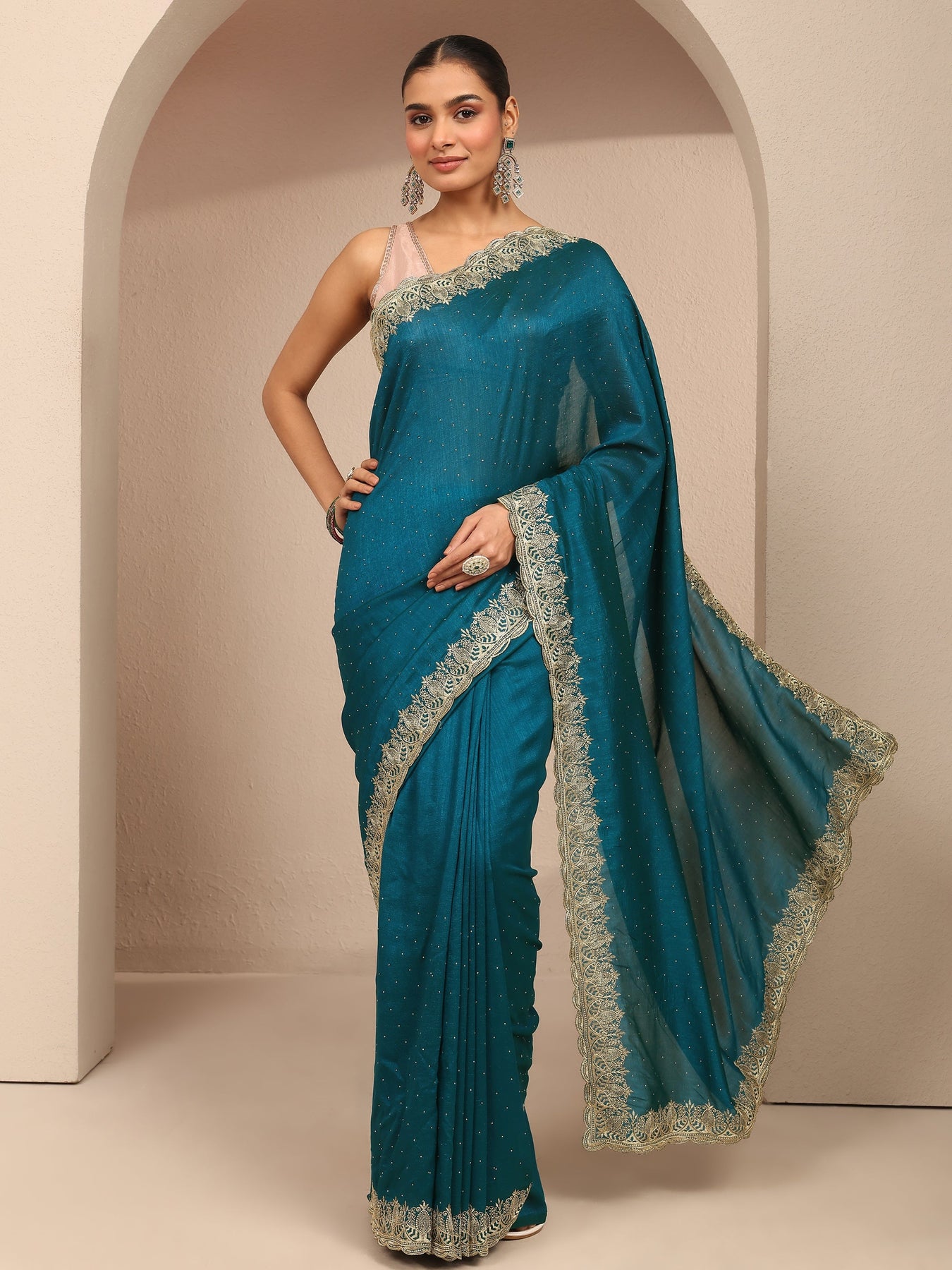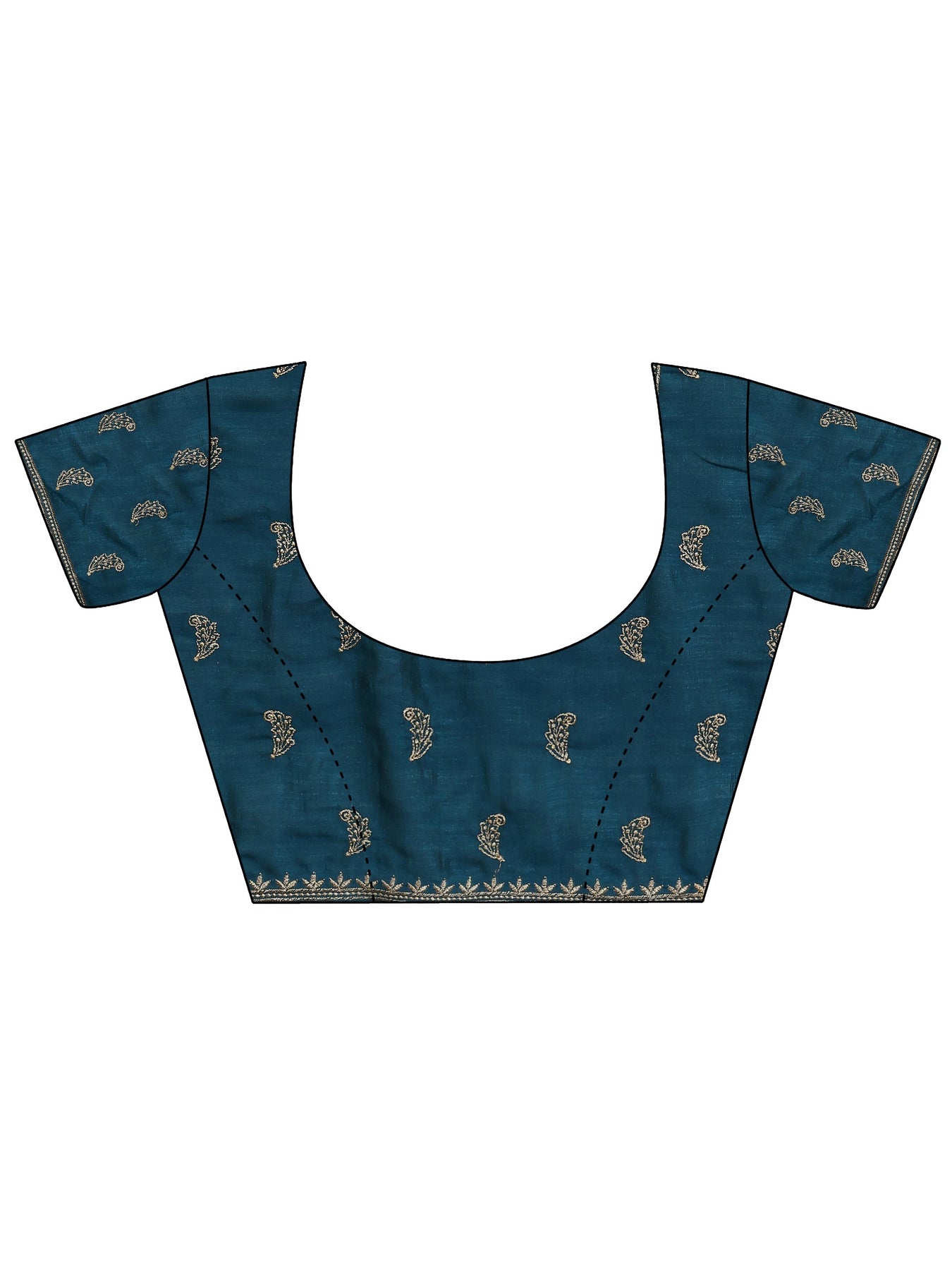 Our teal silk blend saree features captivating embellishments. Complemented with an unstitched blouse piece. This charming saree is perfect for festive occasions.