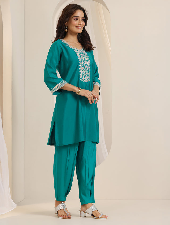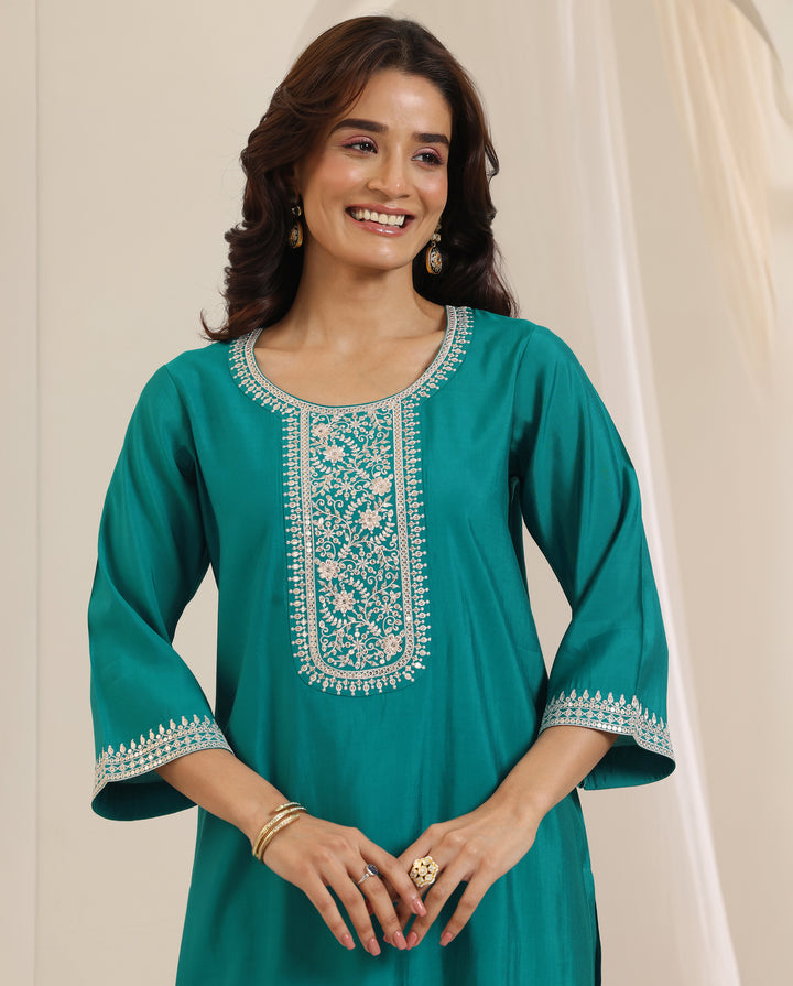 Our 3-piece teal silk blend kurta set features a straight-fit kurta with a round neckline, regular sleeves, and statement yoke. Complemented with salwar pants with an elasticated waistband and an embroidered dupatta. Adorned with embroidered accents, this style is perfect for festive occasions.