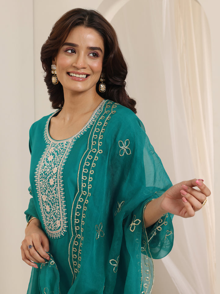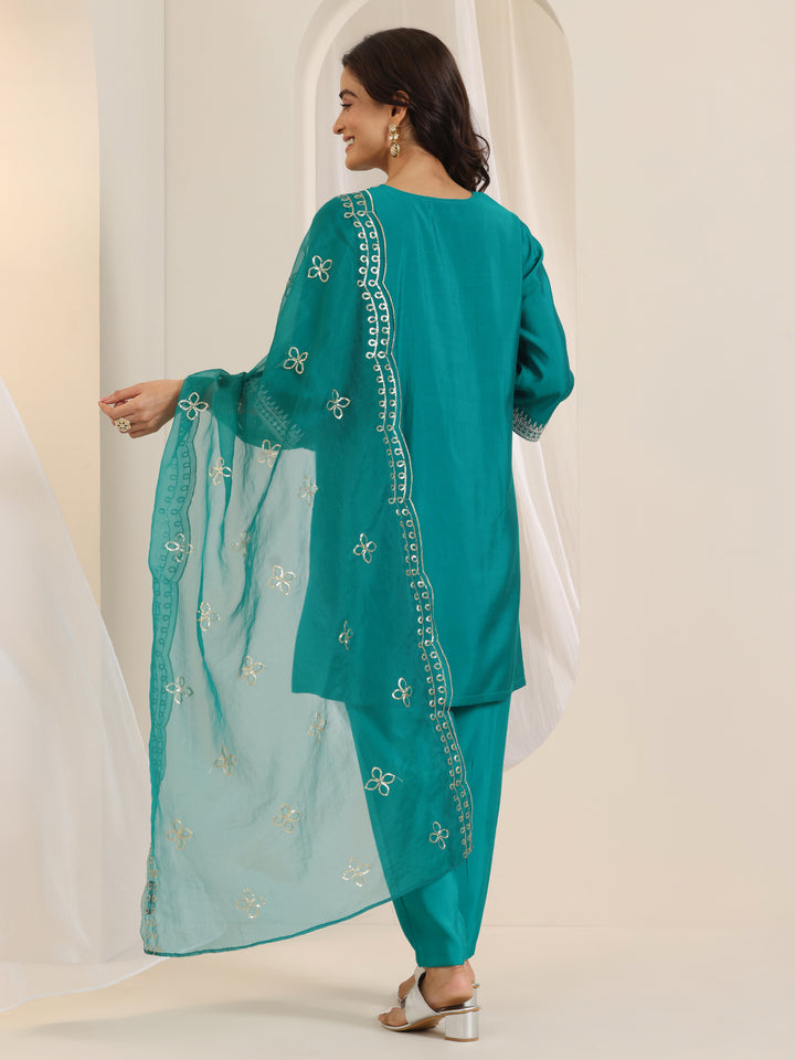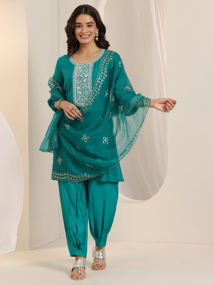 Turquoise Yoke Design Silk Blend Straight Suit Set With Dupatta