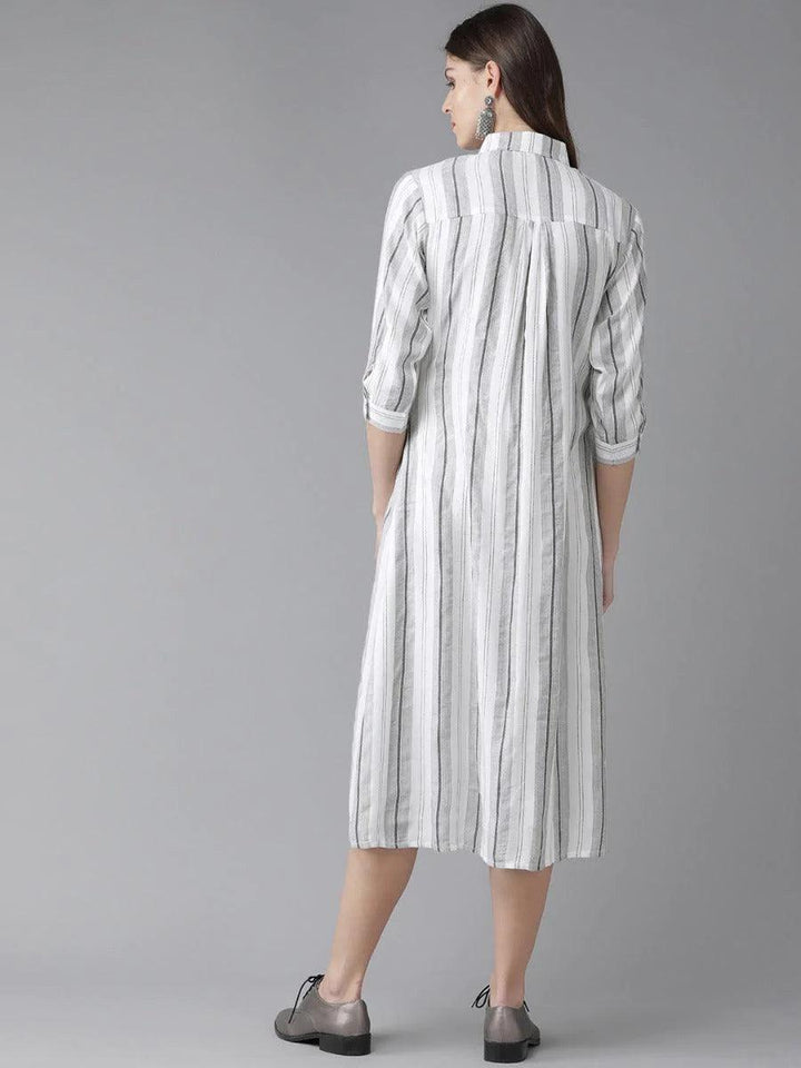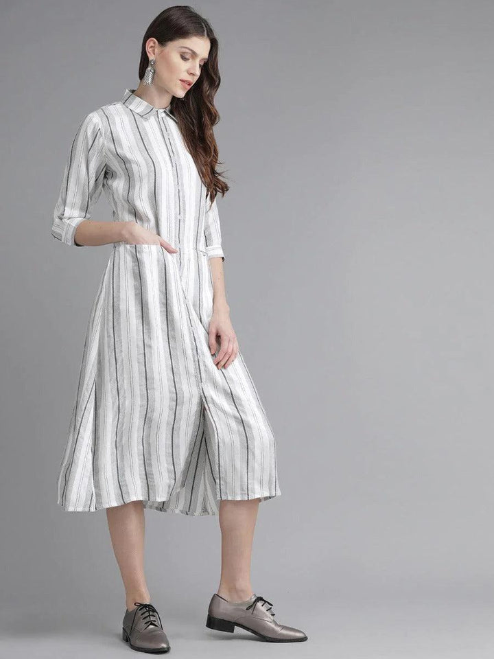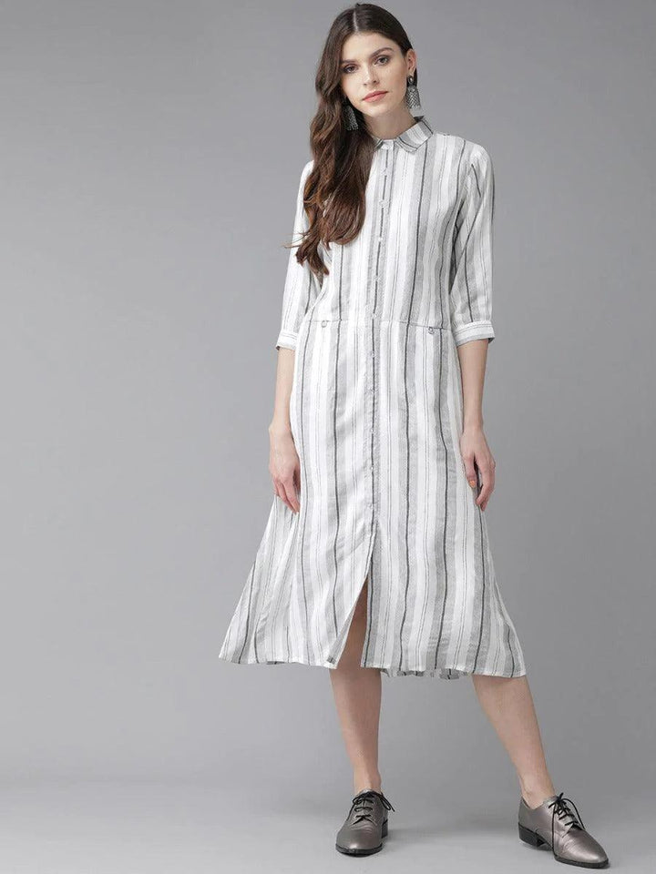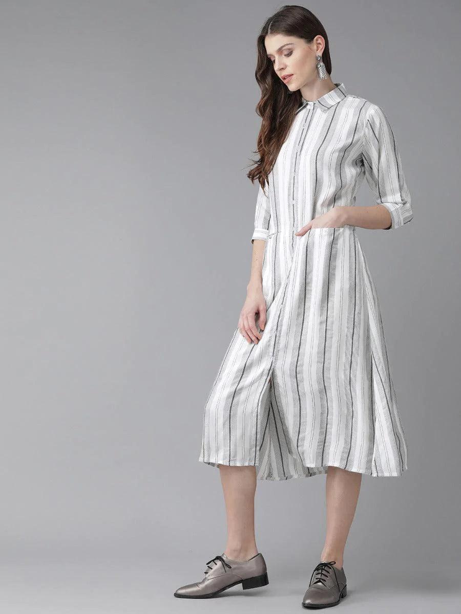 Bring out the fashionista in you with this striped shirt dress from the house of Libas. Designed with button closures, black and white vertical stripes,front slit and two pockets. Carry-off the diva look by styling it with stilettos and a pair of hoop earrings.