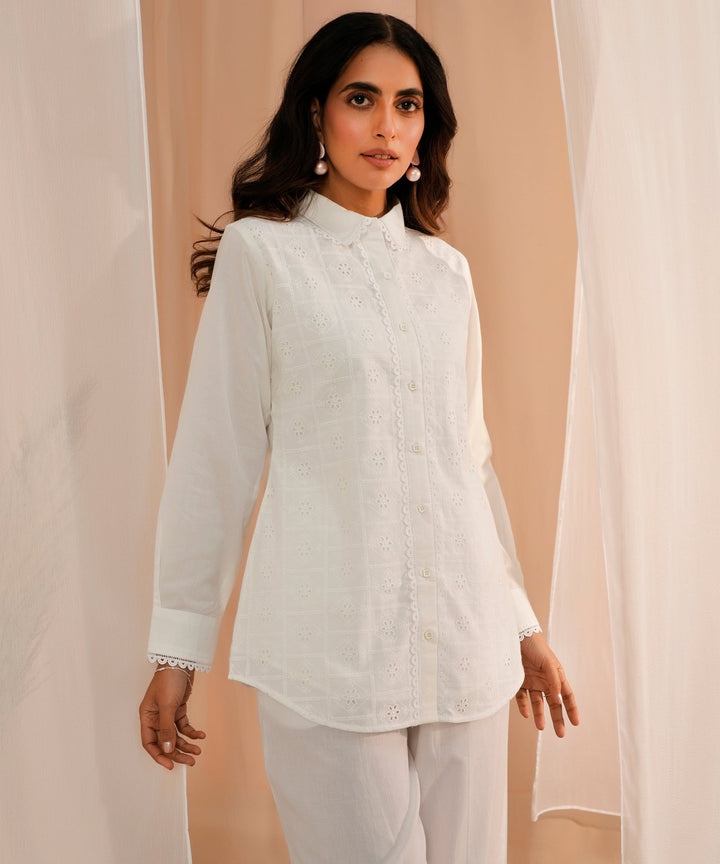 Our white cotton shirt-style kurti features a buttoned-down detailing with comfortable full sleeves. Highlighted with schiffli detailing, stylish buttons, and lace accents, this style is perfect for work and beyond.