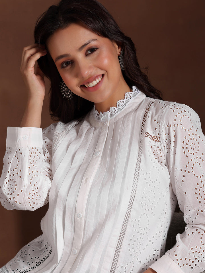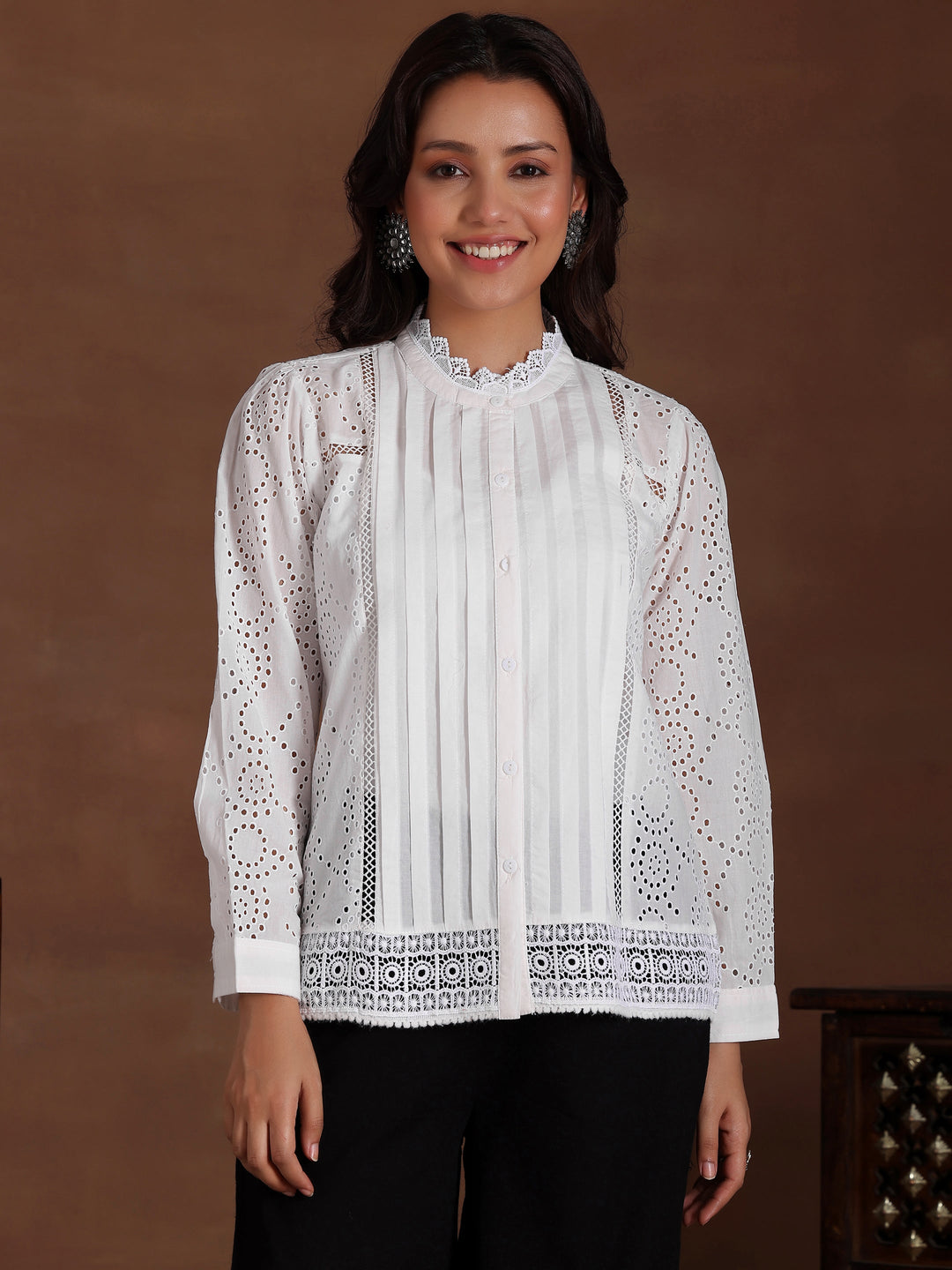 Our white schiffli cotton top features a high neck collar with a buttoned-down detailing and comfortable full sleeves. Highlighted with pleated detailing and cutwork, this elegant style is perfect for casual outings.