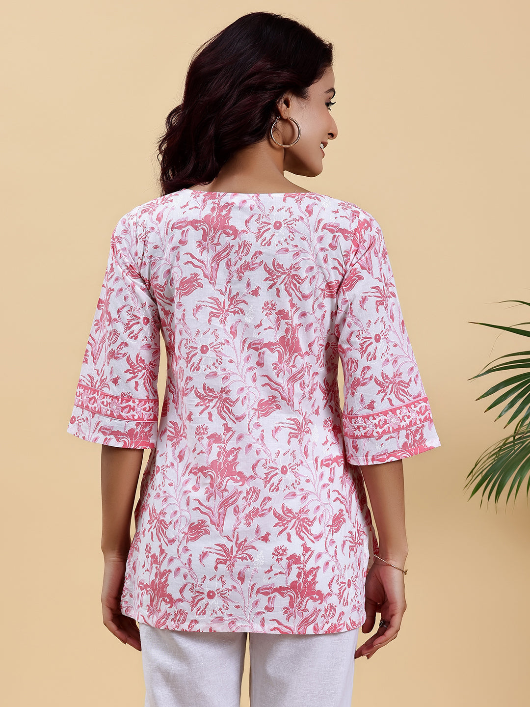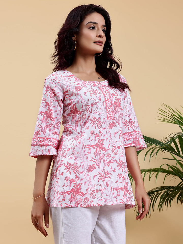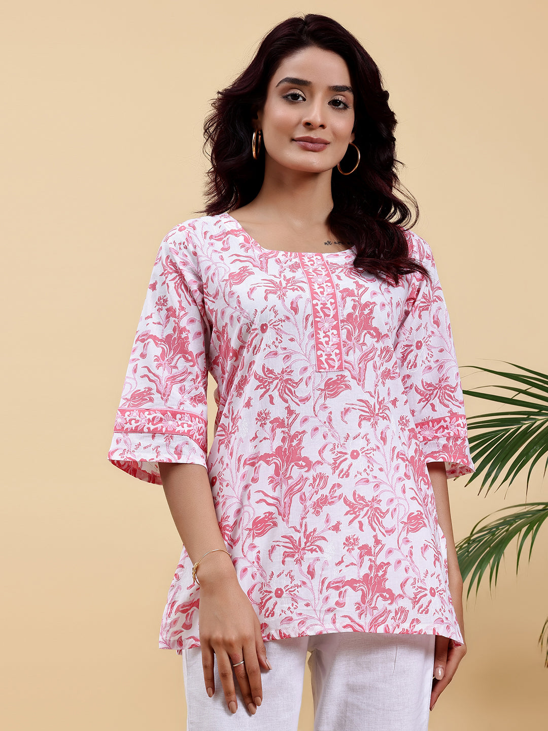 Our white floral print kurta, crafted in comfortable cotton fabric, features an A-line silhouette, a round neckline, and three-quarter flared sleeves. Elevated with fabric-trim accents, this style is perfect for casual outings.
