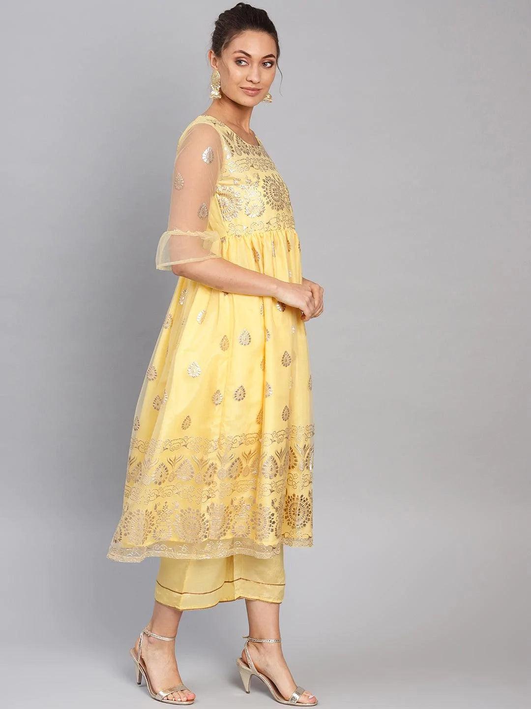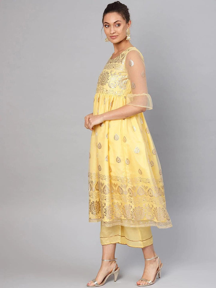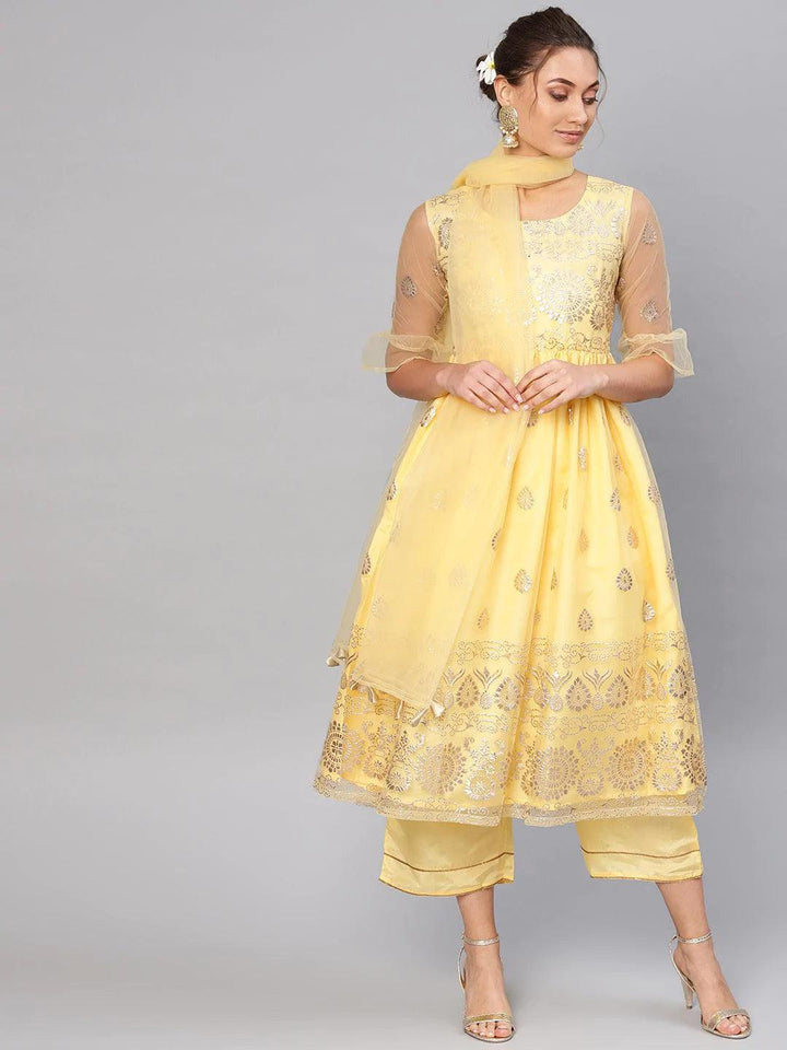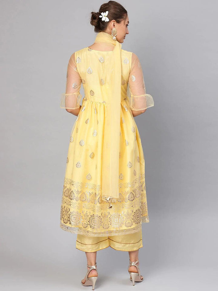 Yellow Block Printed Anarkali Kurta With Palazzo And Stole