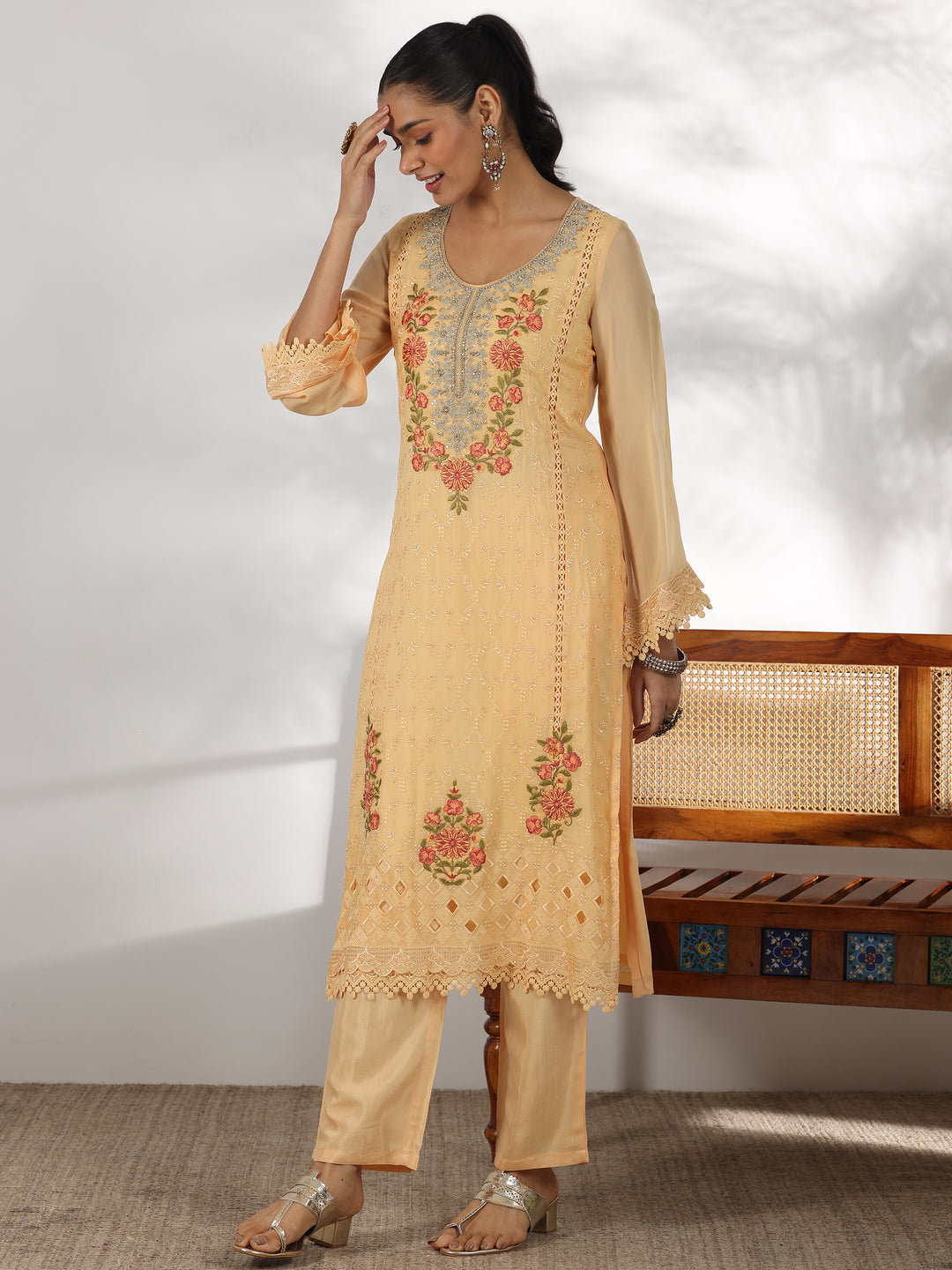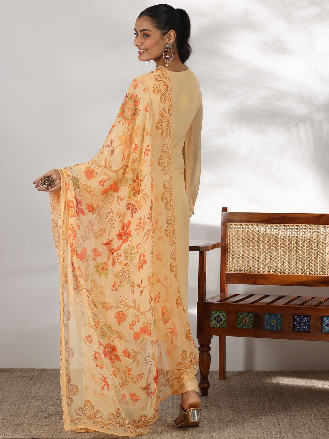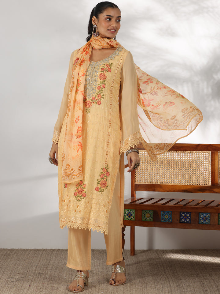 Our 3-piece beige organza straight-fit kurta set features a round neckline, regular sleeves, and a statement yoke. Complemented with straight pants with an elasticated waistband and 2 pockets, and a printed dupatta. Adorned with embroidered accents, this style is perfect for festive occasions.