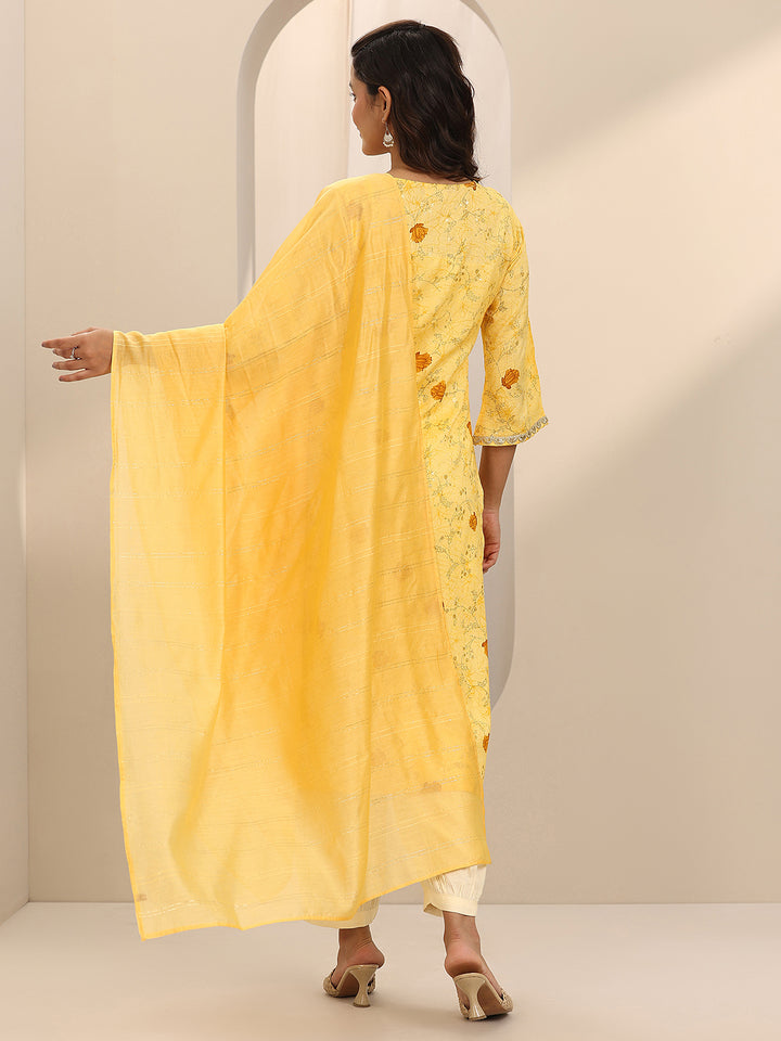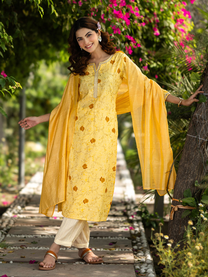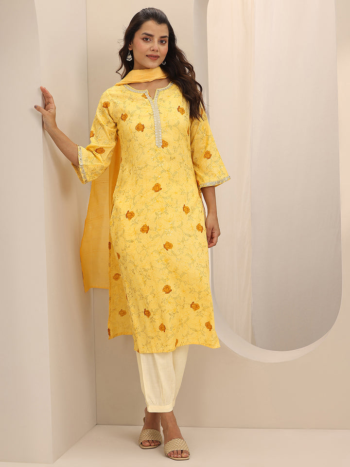 Yellow Printed Cotton Blend Straight Suit Set With Dupatta