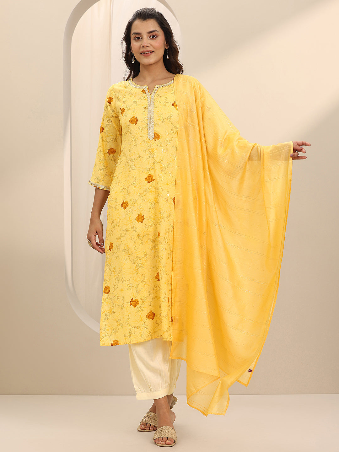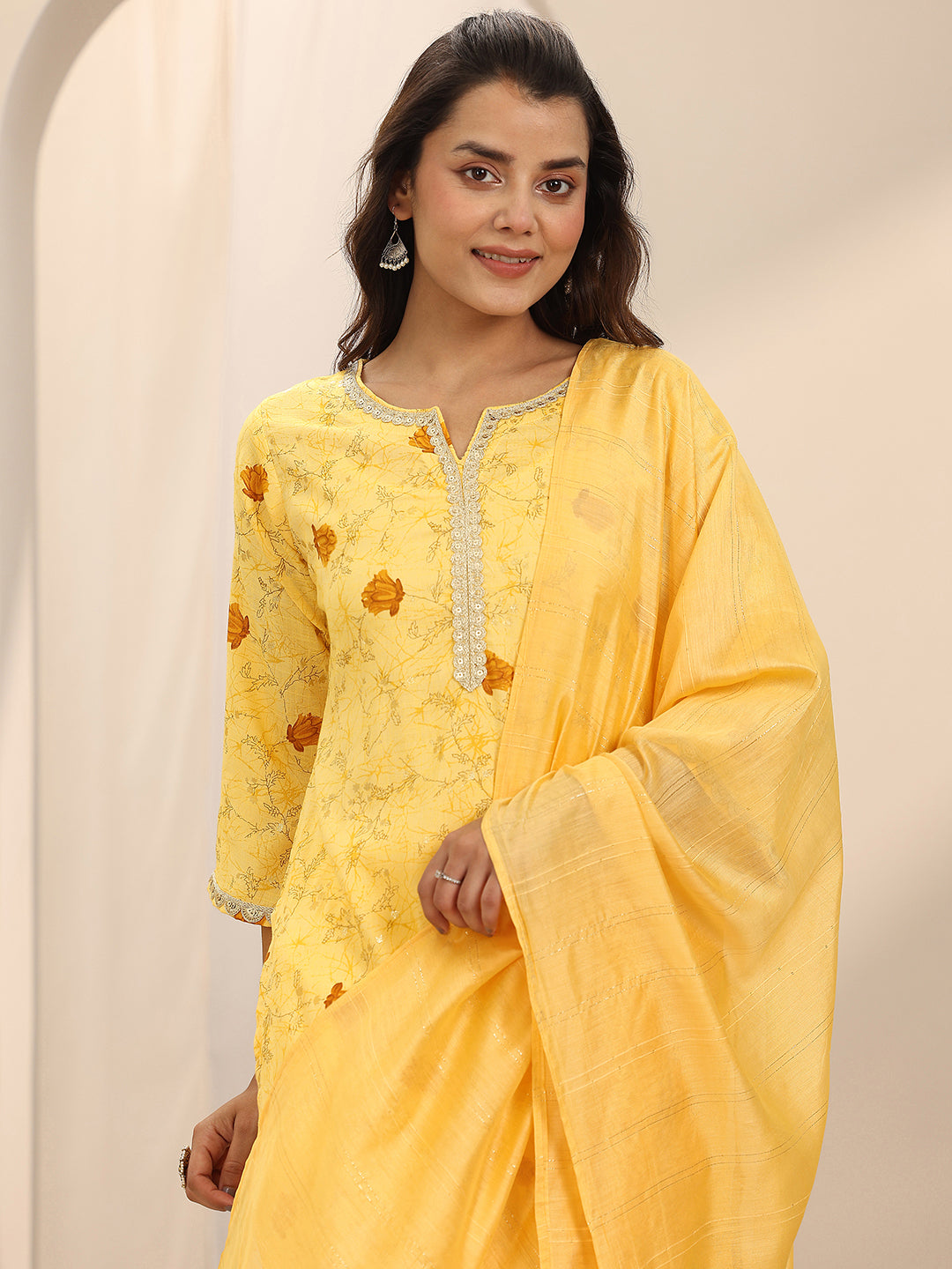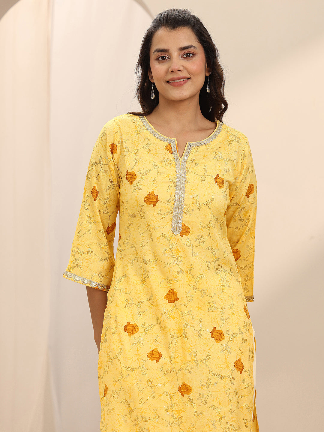 Our 3-piece Yellow Cotton Blend Straight-fit Kurta Set features a Notched Neckline, Bell Sleeves, and statement Yoke. Complemented with Straight Pants with an Elasticated waistband and 2 pockets, and a Solid Dupatta. Adorned with Floral prints, this style is perfect for Semi Festive occasions.