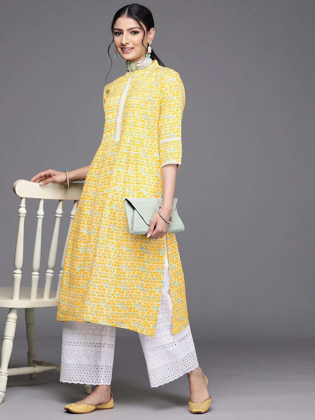 Our yellow printed straight fit cotton kurta features a mandarin collar, delicate pintuck detailing on the yoke, three-quarter sleeves, and roomy pockets. Elevated with complementing lace accents, this refreshing style is ideal for work and beyond.