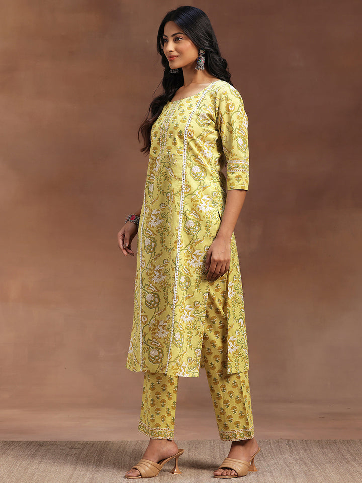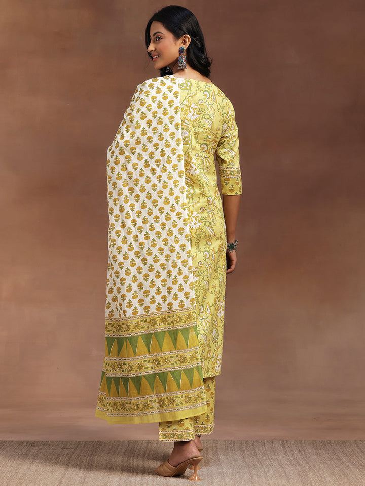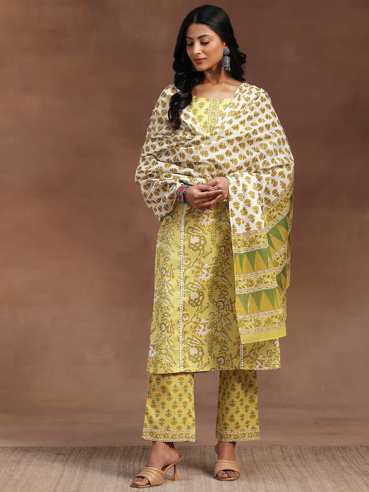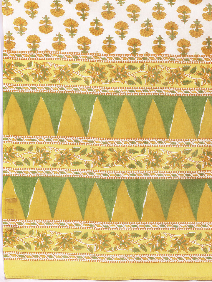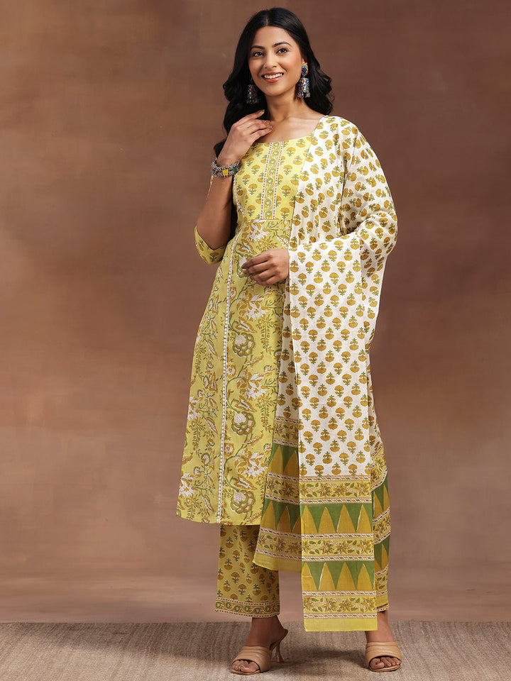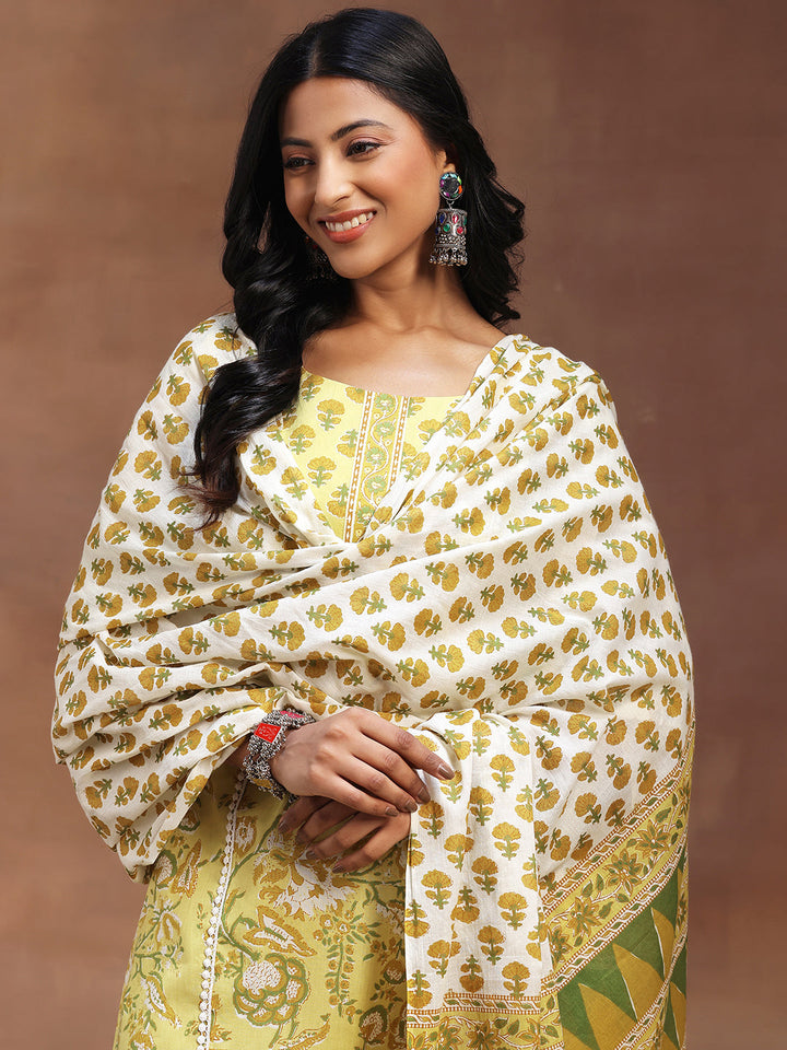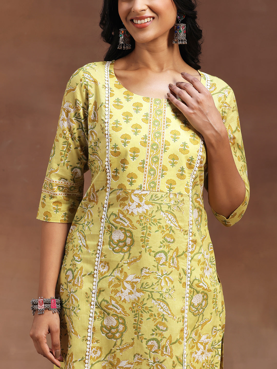 Our 3-piece yellow printed cotton suit set features a straight-fit kurta with a round neckline and three-quarter sleeves. Complemented with trousers with a partially elasticated waistband and roomy pockets, and a dupatta. Highlighted with fabric-trim detailing and lace detailing, this is the perfect pick for casual outings.