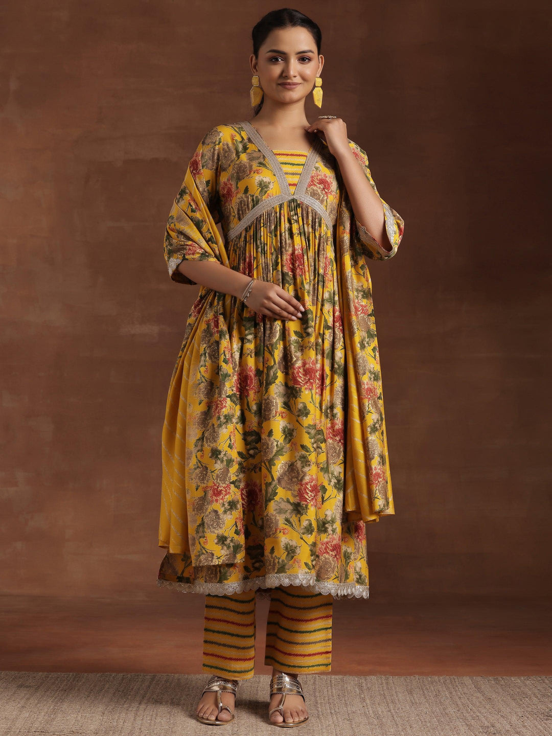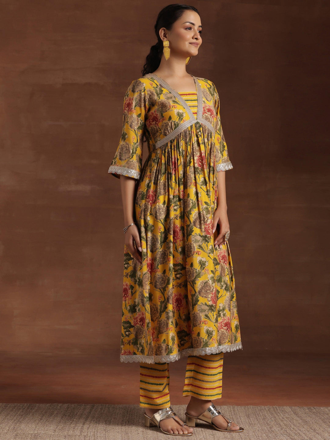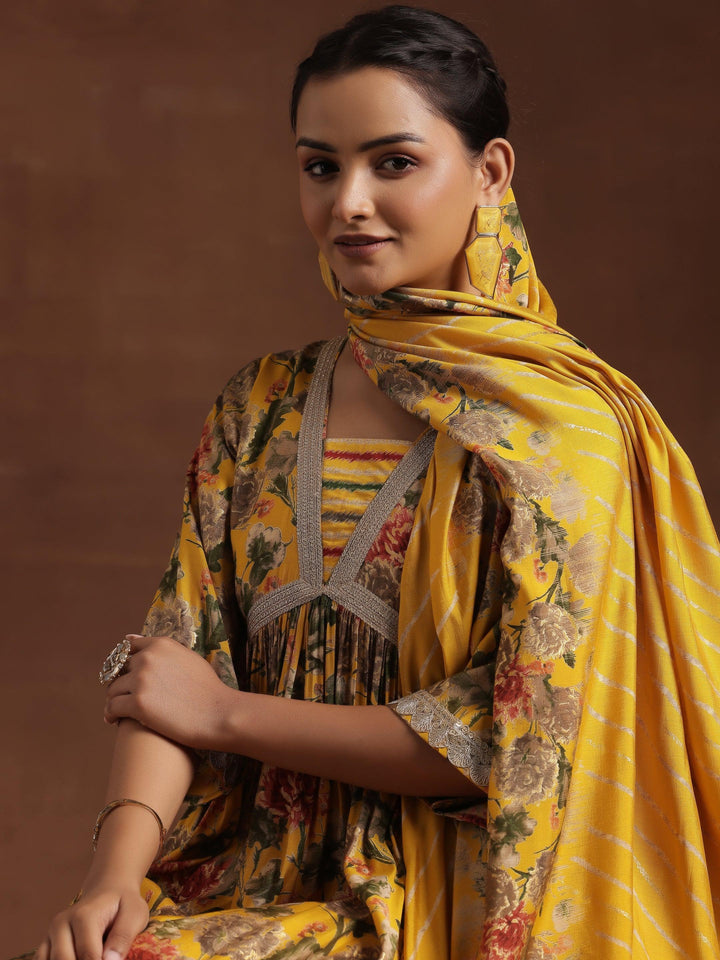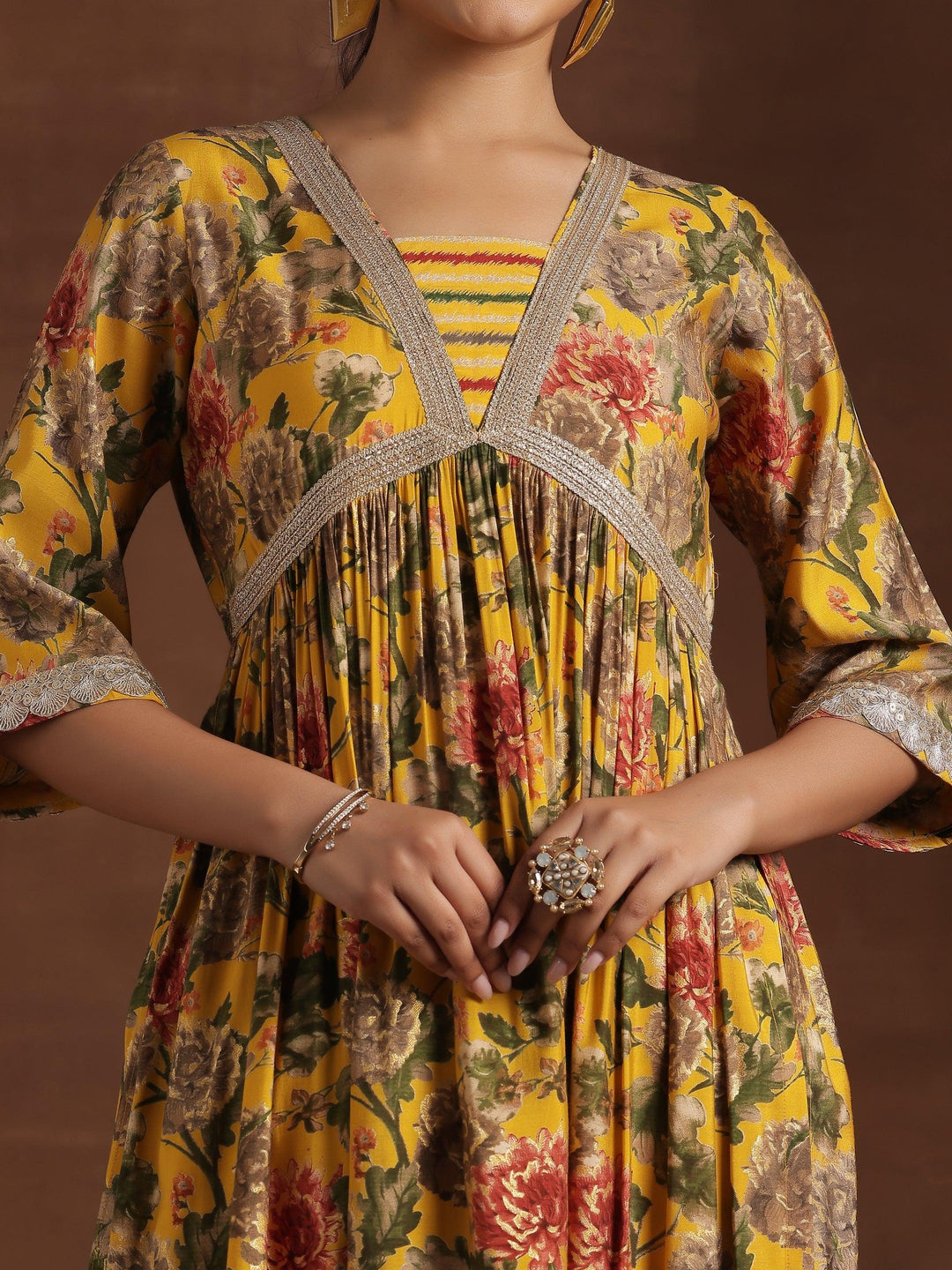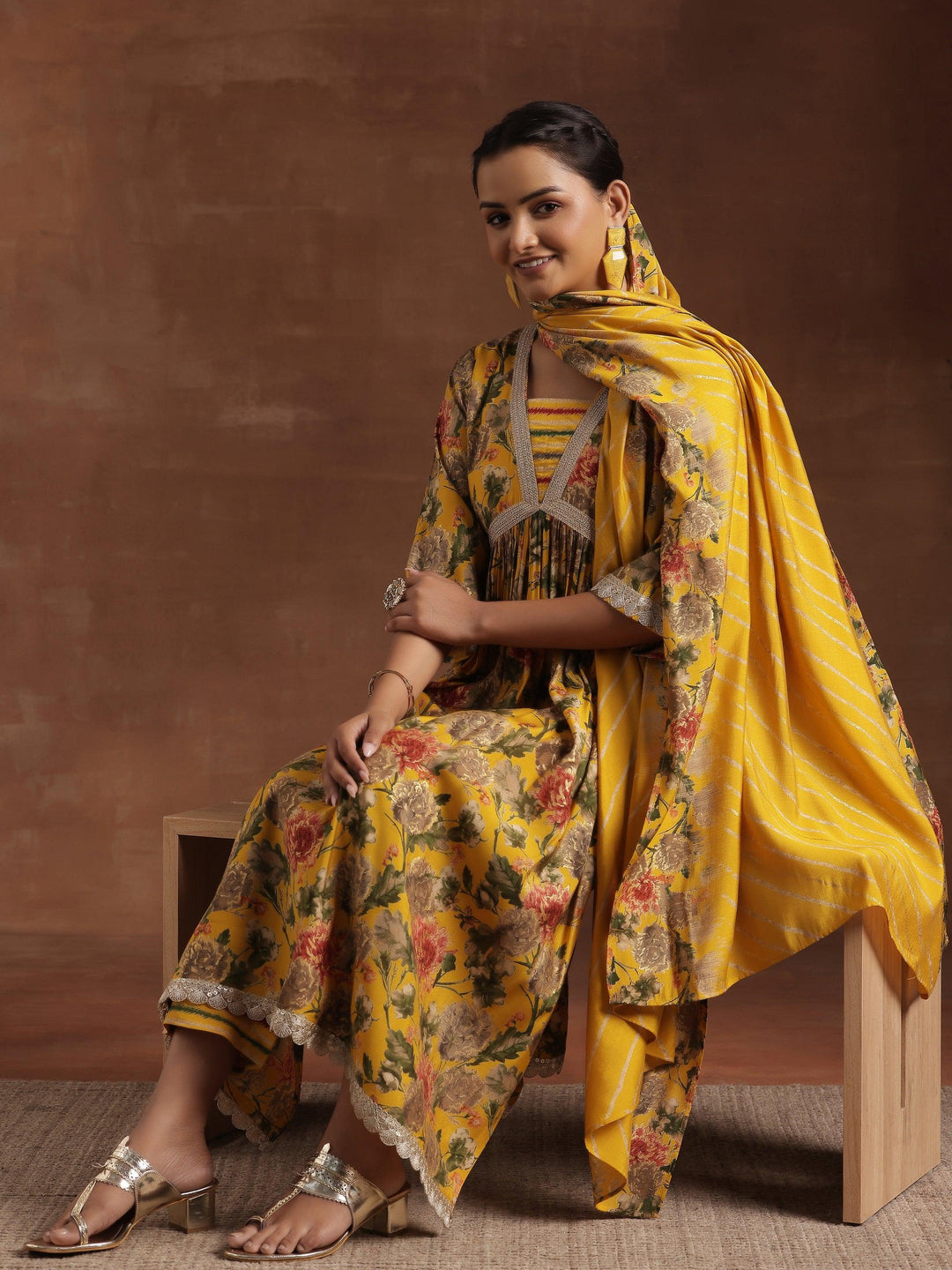 Yellow Printed Silk Blend A-Line Kurta With Trousers & Dupatta