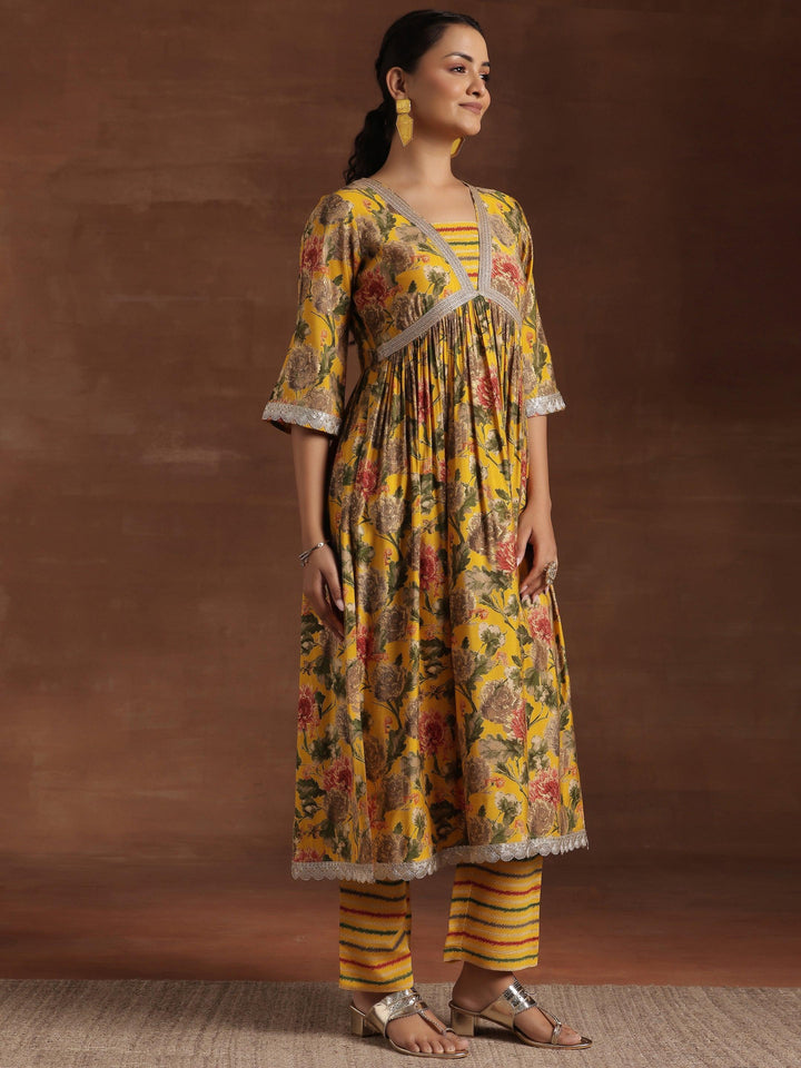 Our 3-piece yellow printed silk blend suit set features an A-line kurta with a V-neckline and three-quarter flared sleeves. Complemented with trousers with a partially elasticated waistband and roomy pockets. Elevated with Gota Patti detailing, this charming style is perfect for light festivities.