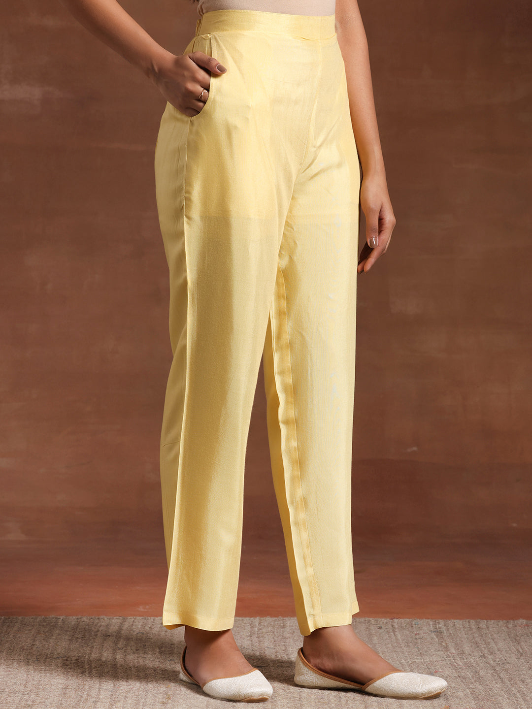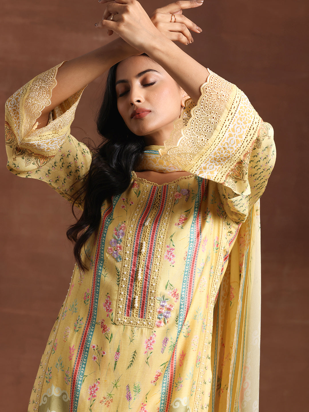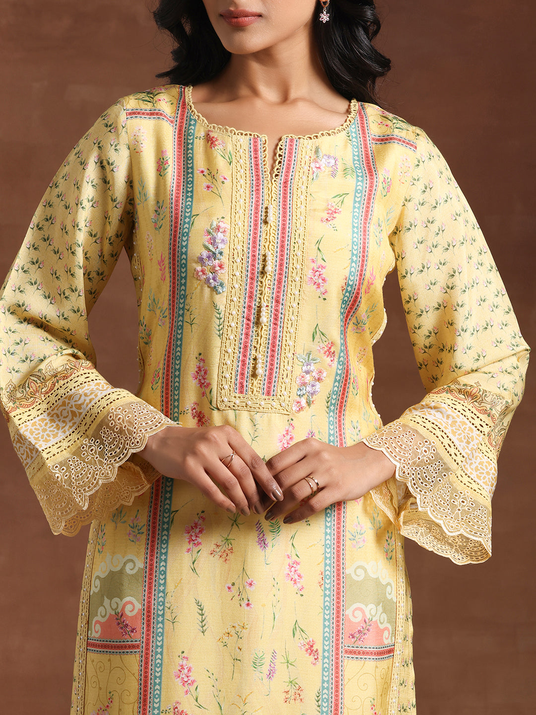 Our 3-piece yellow printed silk blend suit set features a straight-fit kurta with a notched neckline and three-quarter flared sleeves. Complemented with trousers with a partially elasticated waistband and roomy pockets, and a dupatta. Adorned with charming floral prints, Schiffli detailing, lace and beaded accents, this style is perfect for light festivities.