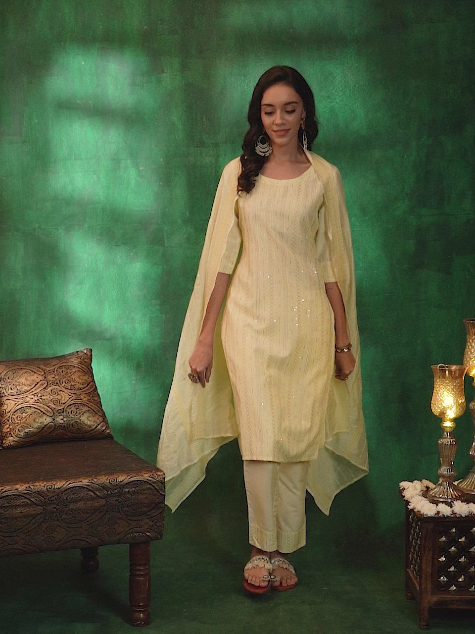 Yellow Self Design Silk Blend Straight Kurta With Palazzos & Dupatta