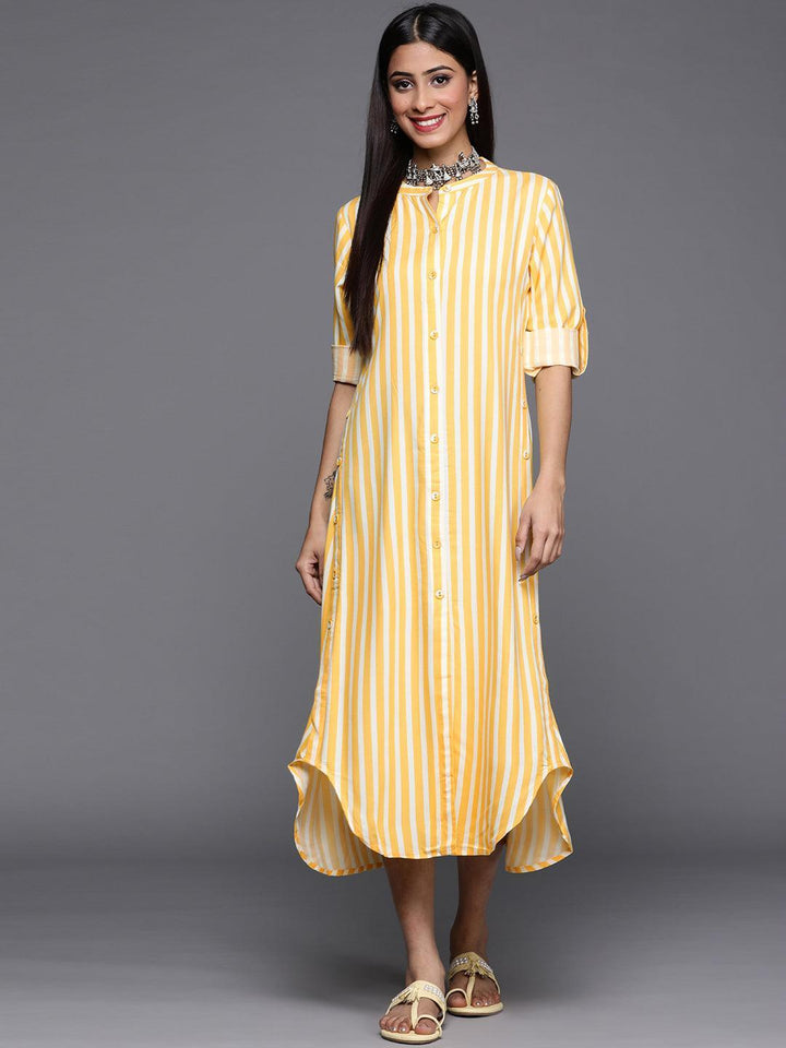 Our yellow striped button-down collar shirt dress, crafted in soft rayon fabric features three-quarter roll-up sleeves, a stylish front-slit and a flared hemline. This comfortable is style ideal for casual outings.