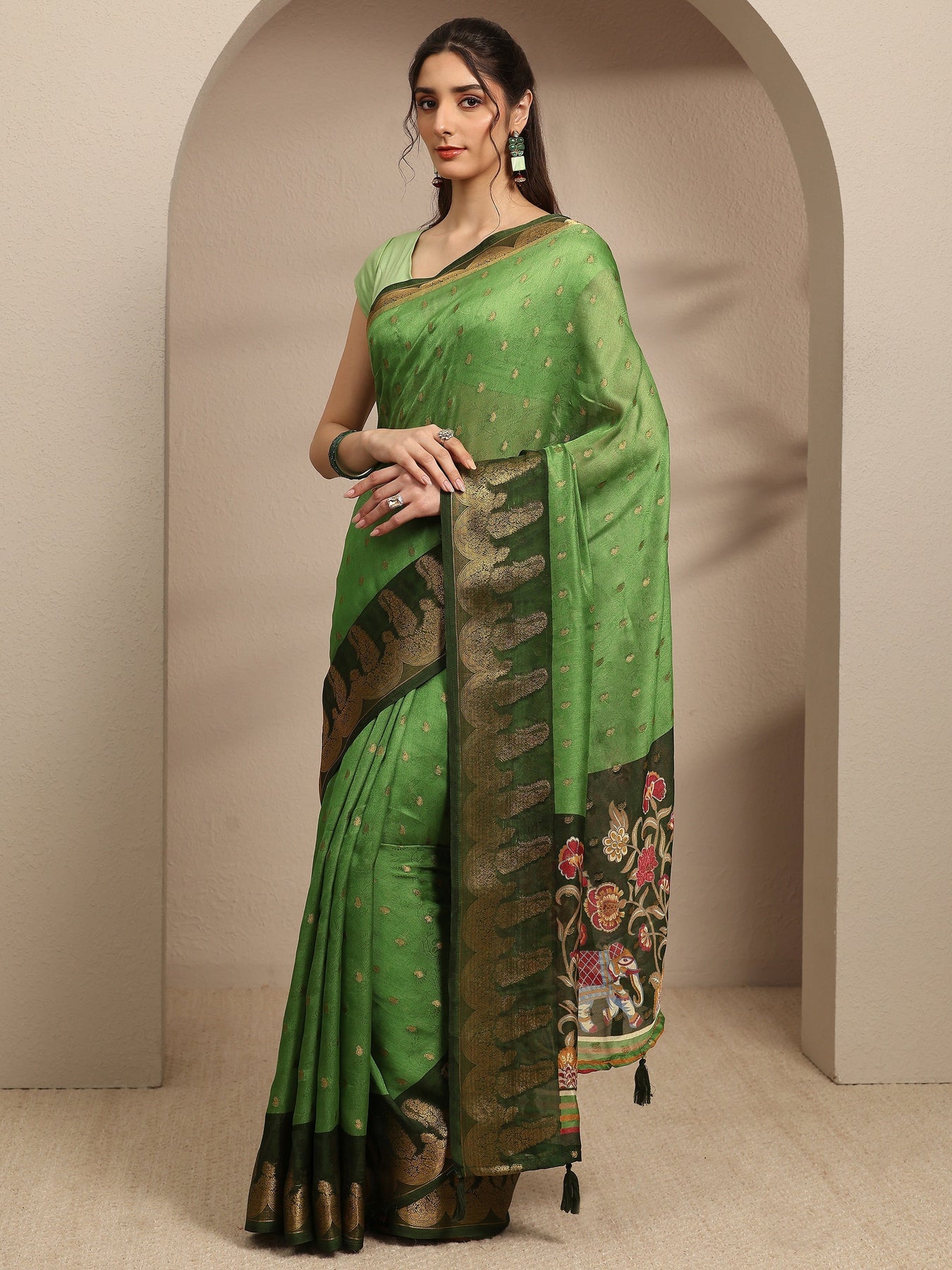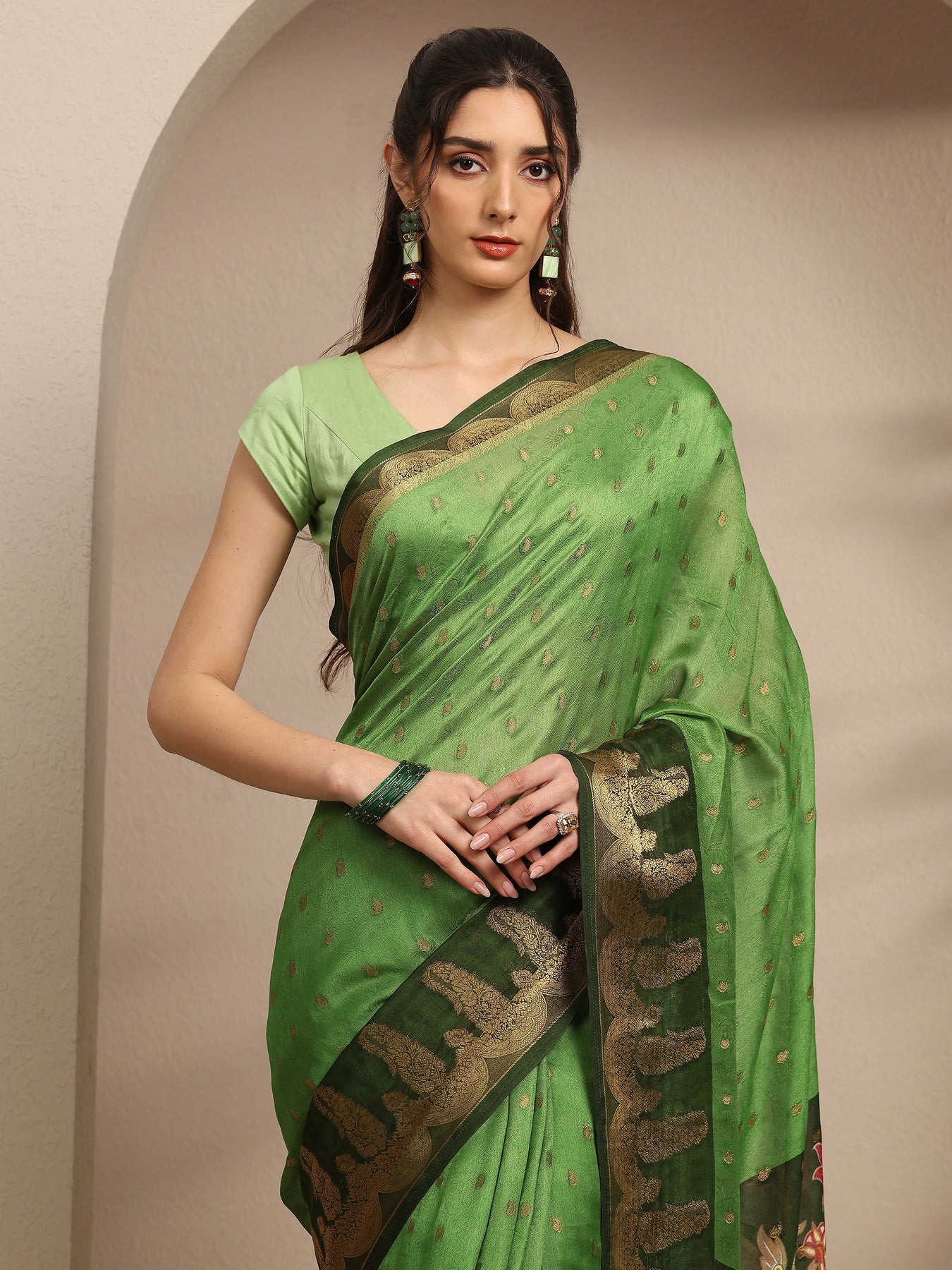 Green Ethnic Motifs Printed Silk Blend Saree With Unstitched Blouse Pi