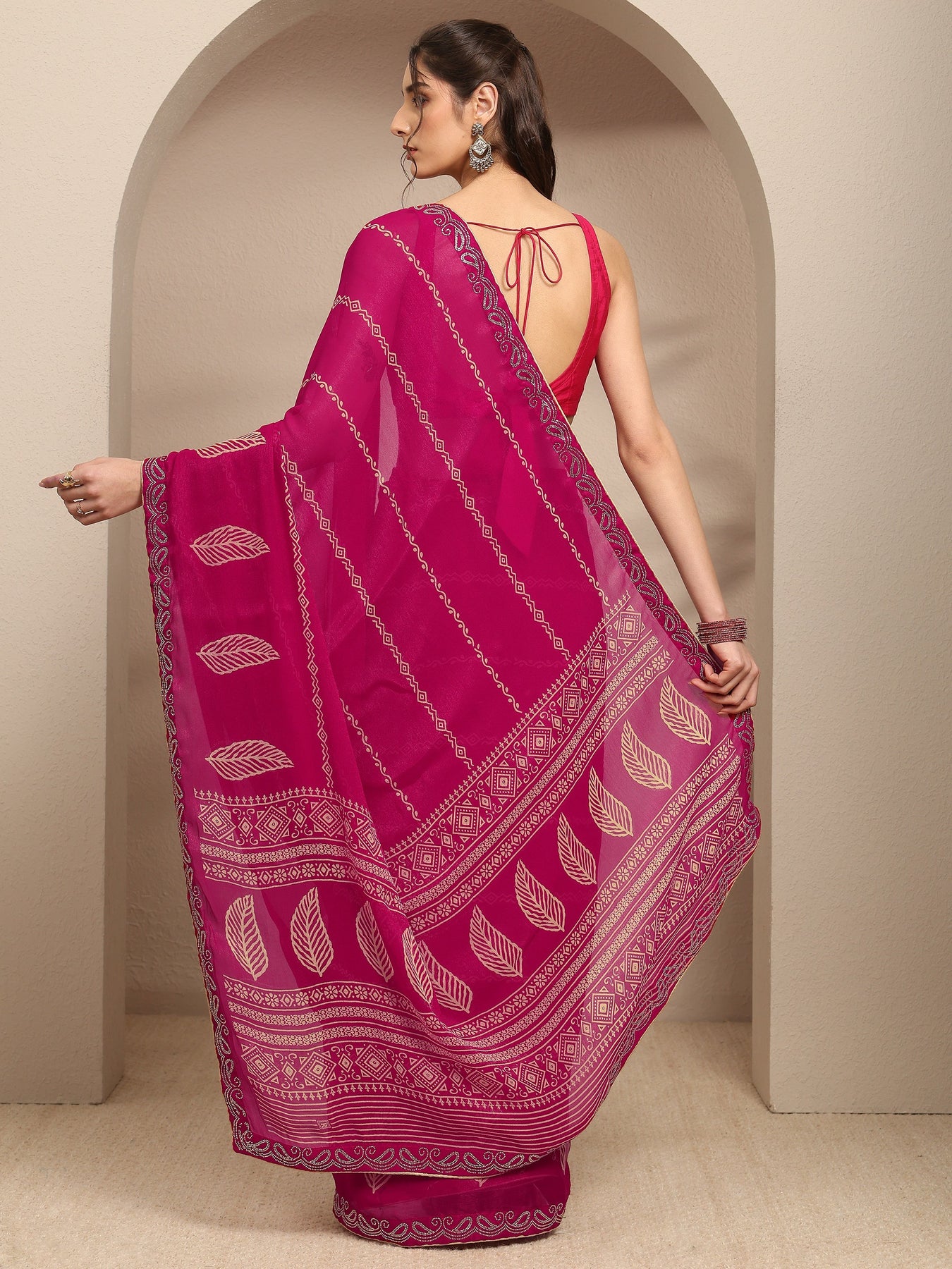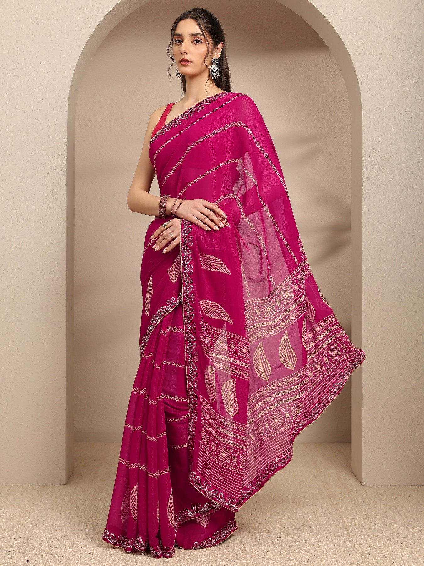 Our magenta printed silk blend saree features a captivating tribal motif design inspired by Batik Print sarees. Complemented with a Unstitchedblouse. This charming saree is perfect for festive occasions.
