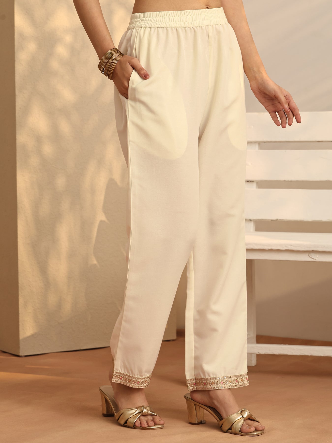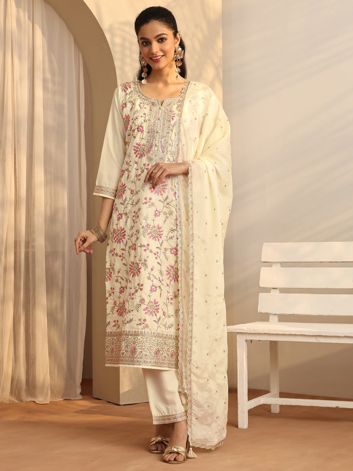 Off white Embroidered Silk blend Straight Suit Set With Dupatta