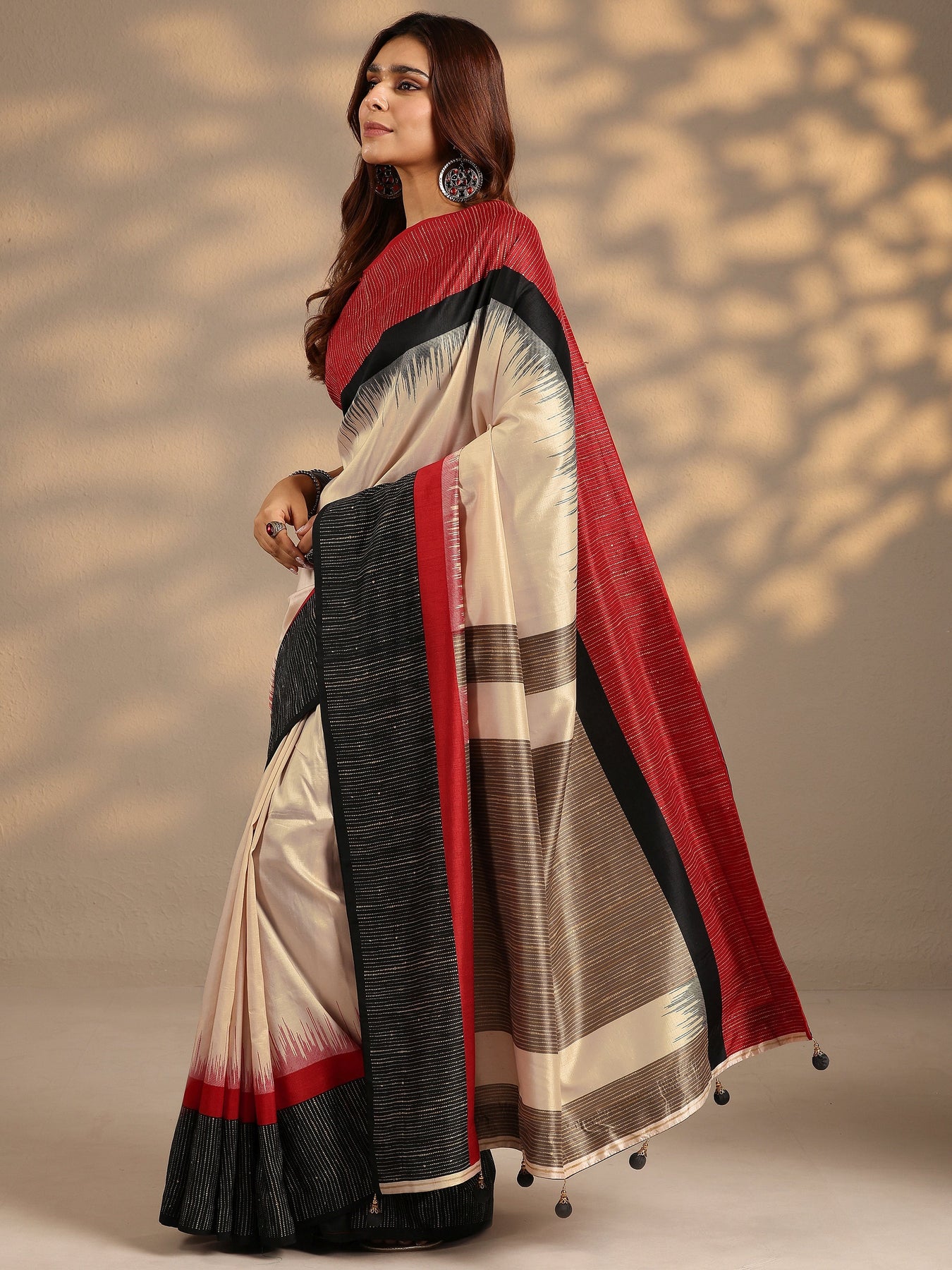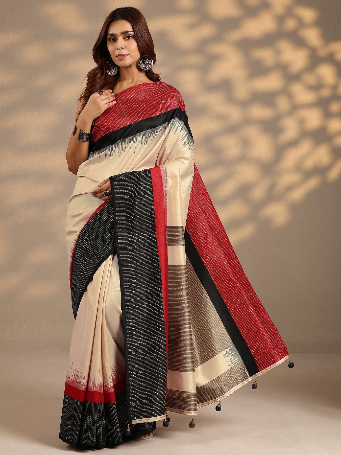 Beige Solid Silk Blend Saree With Unstitched Blouse Piece